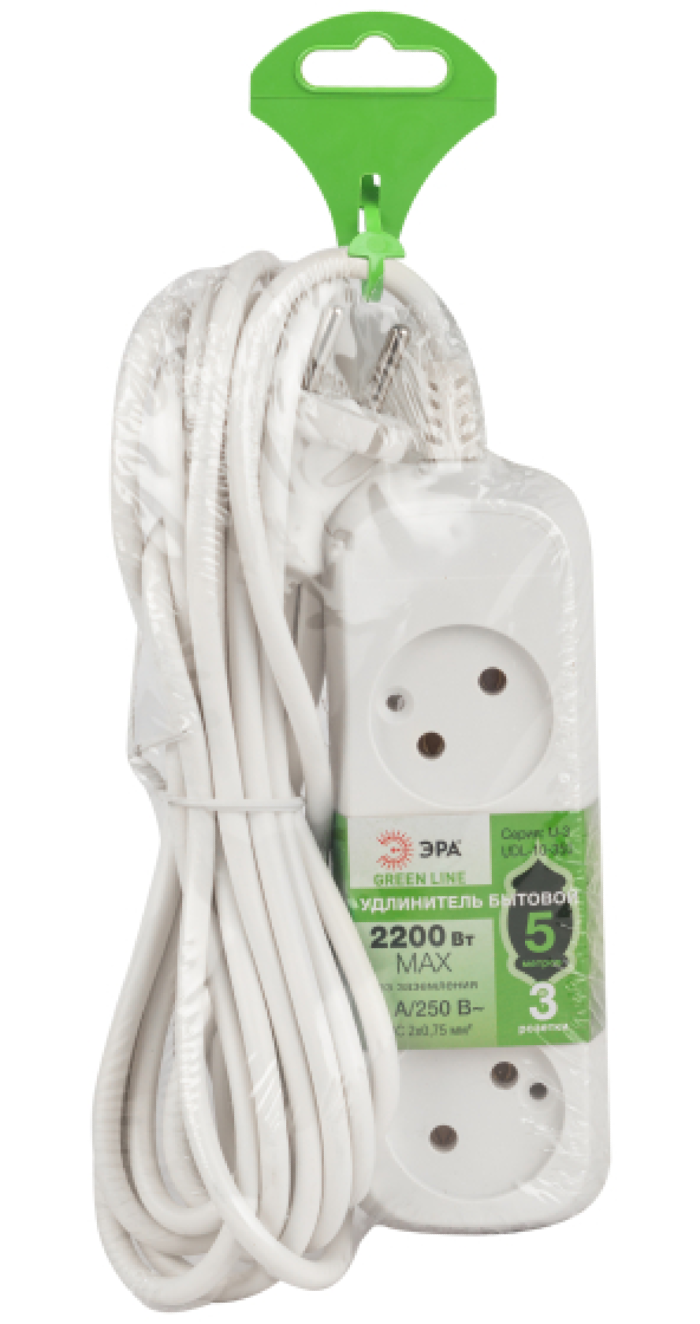- Удлинитель бытовой ЭРА UDL-10-350 Greenline без заземления, ПВС 2х0.75мм², 5 метров, 3 розетки белый Б0065073 - 1шт.