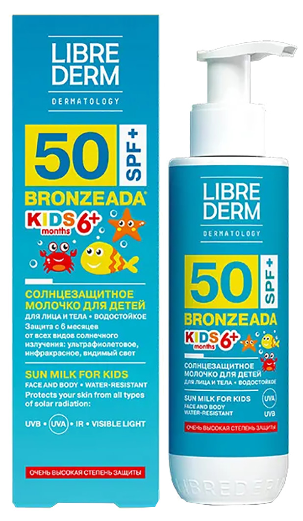 Librederm / Либридерм Bronzeada Kids 6+ Детское молочко солнцезащитное SPF-50+ с пантенолом водостойкое 150мл