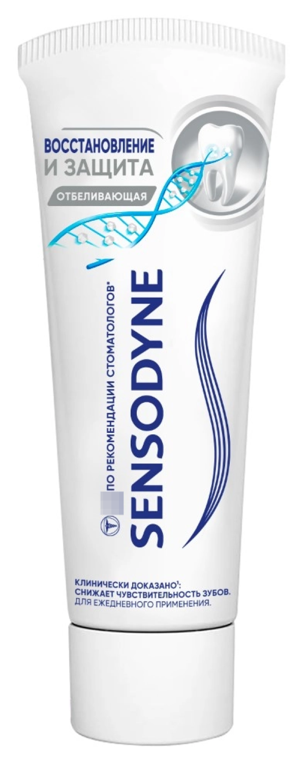 Sensodyne Восстановление и защита Зубная паста отбеливающая для чувствительных зубов укрепляет эмаль и защищает зубы. Паста зубная предназначена для ежедневной гигиены полости рта с целью обеспечения длительной защиты от кариеса, снижения растворимости и укрепления зубной эмали.