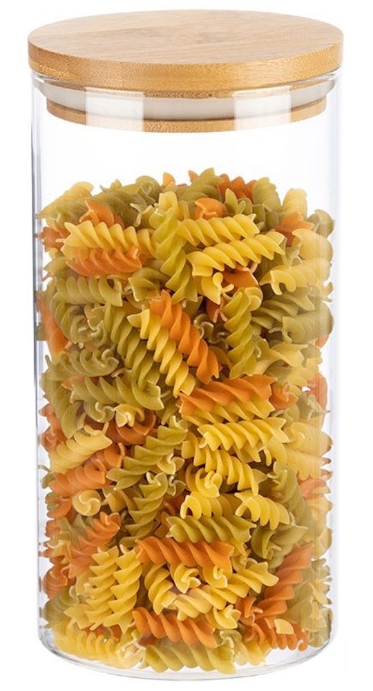 Банка для сыпучих продуктов с крышкой из бамбука (прокладка из силикона) изготовлена из стекла. Имеет плотно закрывающуюся крышку, которая защищает продукты от влаги и посторонних запахов. В ёмкости удобно хранить крупы, специи, макаронные изделия, сахар, муку и бобовые. Объем: 1,5 л, размер — 11×20,6 см, толщина стекла — 2,2 мм. Можно мыть банку без крышки в посудомоечной машине. Материалы — боросиликатное стекло, бамбук, силикон. Коэффициэнт линейноо расширения — (3.3 0.1) 10-6/K.