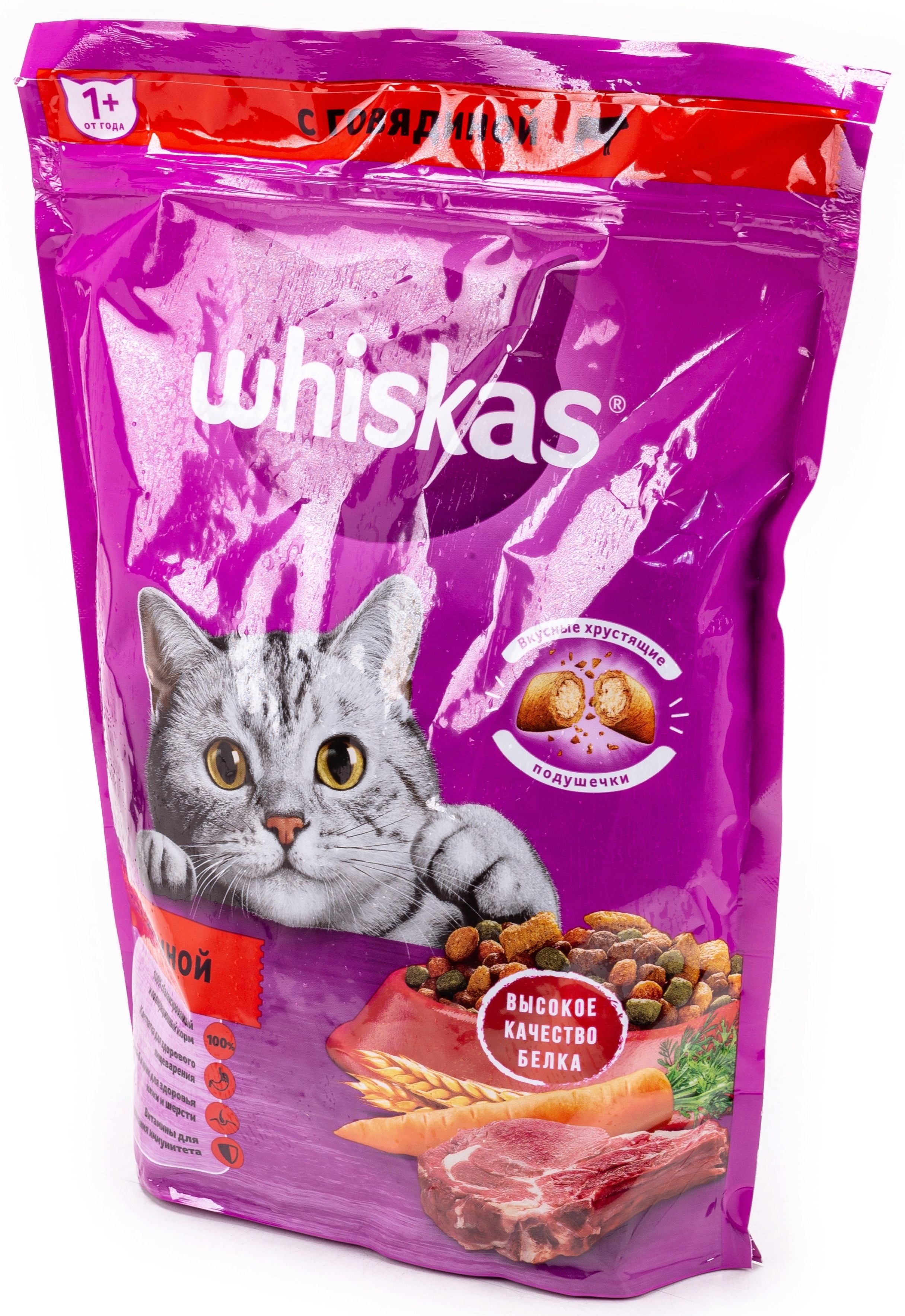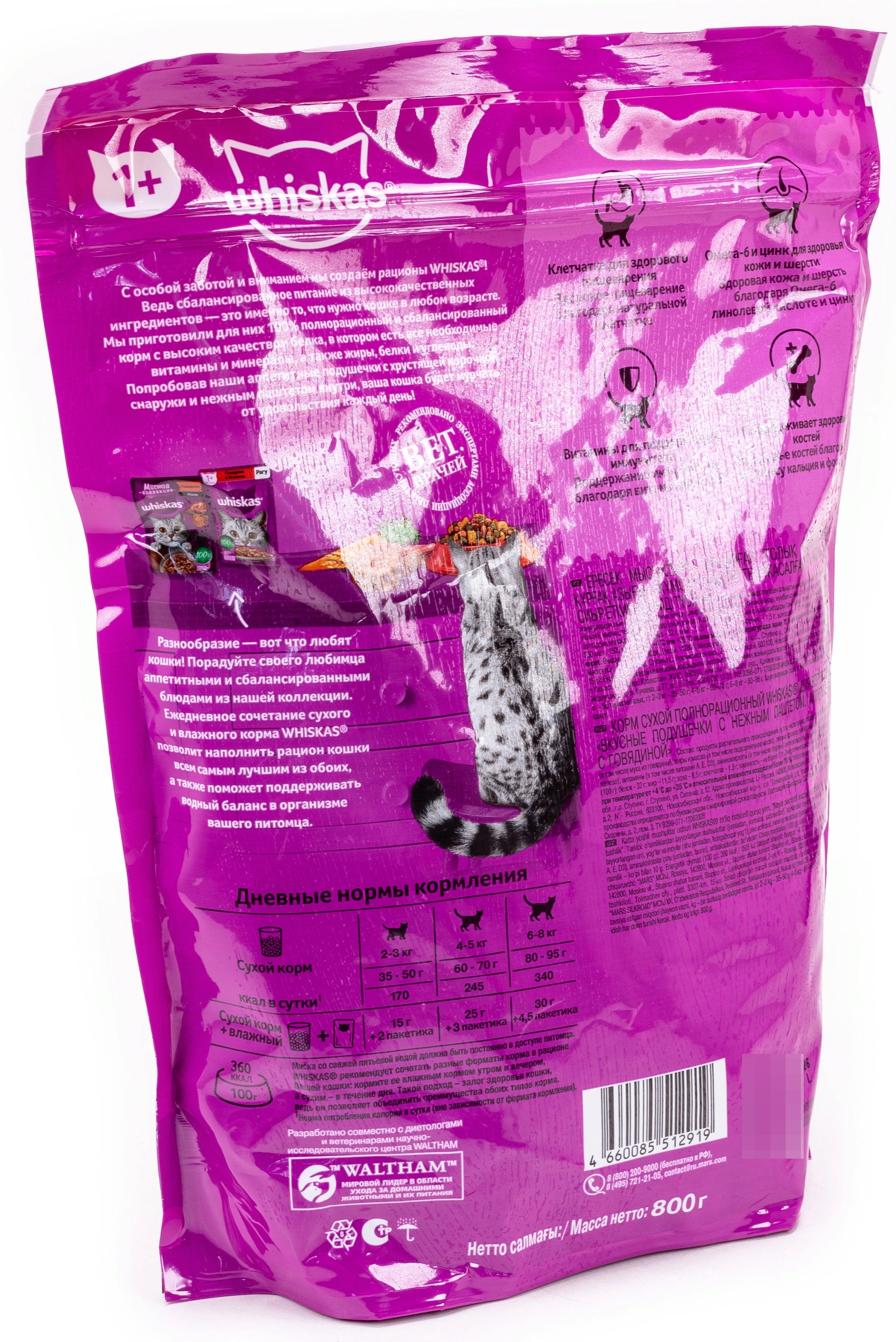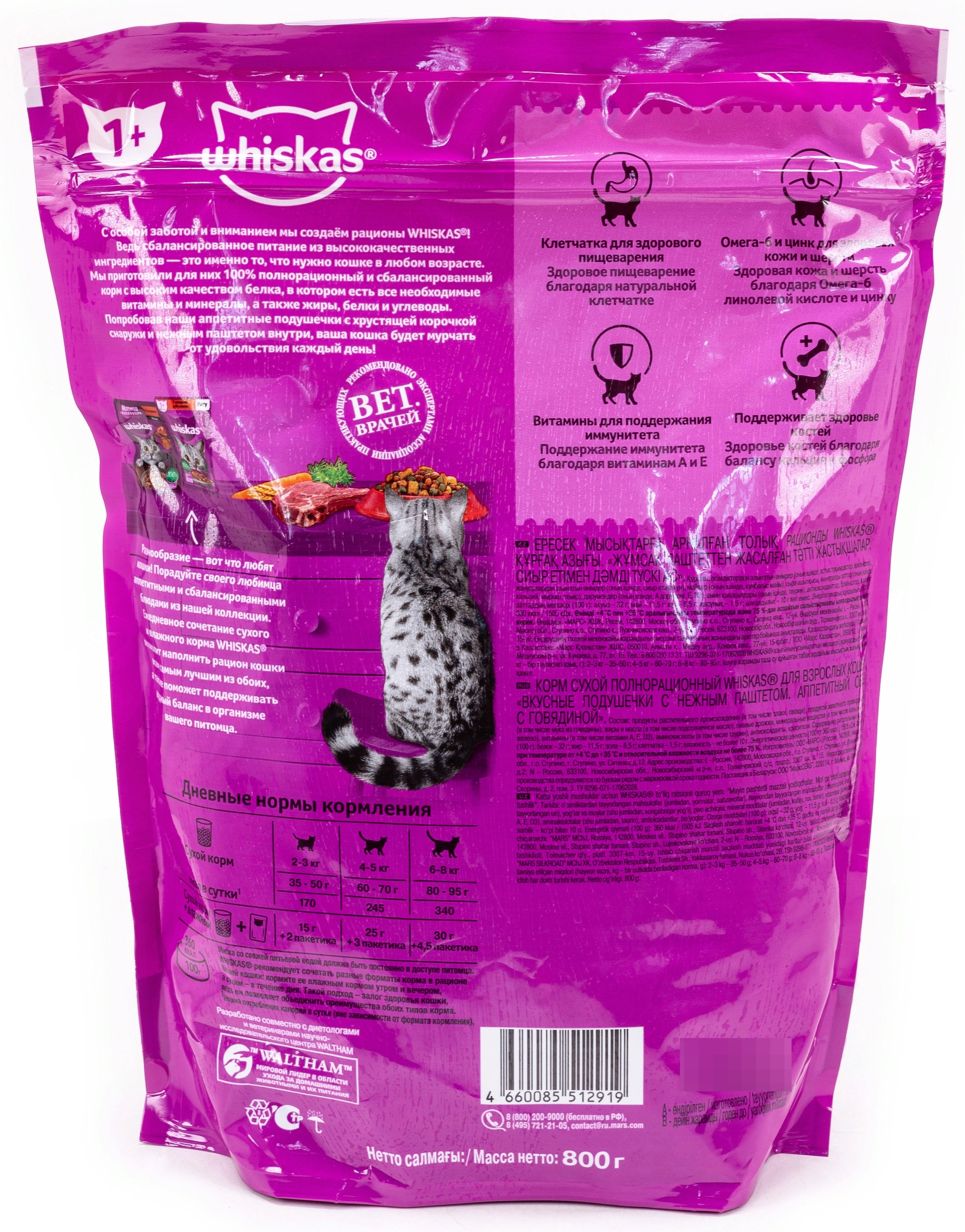Корм сухой для кошек Whiskas / Вискас хрустящие подушечки с нежным паштетом, говядина 800г / зоотовары