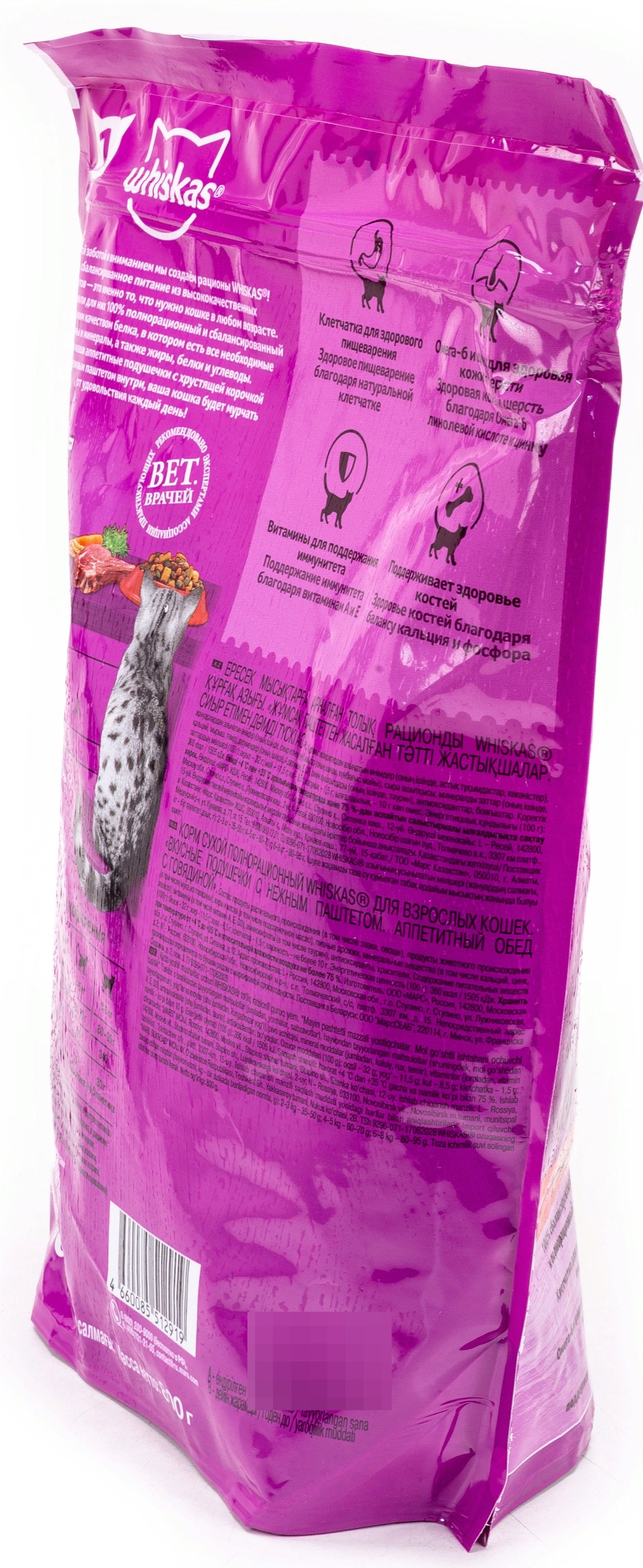 Корм для кошек Whiskas Подушечки с говядиной реализуется в индивидуальной упаковке — пакете. Содержит в своем составе: злаки и продукты их переработки, мука животного происхождения (в том числе из говядины), растительные белковые экстракты, животные жиры и растительные масла (в том числе подсолнечное масло), гидролизат из продуктов животного происхождения, минеральные вещества, витамины, свекловичный жом, пивные дрожжи, аминокислоты (в том числе таурин), красители, морковь сушеная, антиоксиданты.