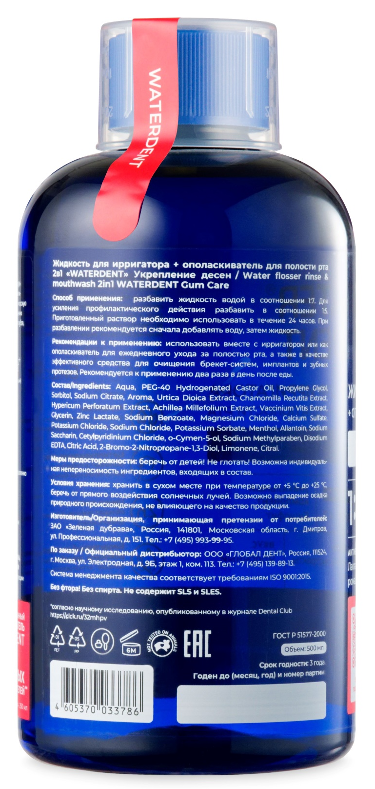 Waterdent / Вотердент Ополаскиватель для полости рта+жидкость для ирригатора 2в1 Укрепление десен, от кариеса, с лактатом цинка 500мл / средство для защиты