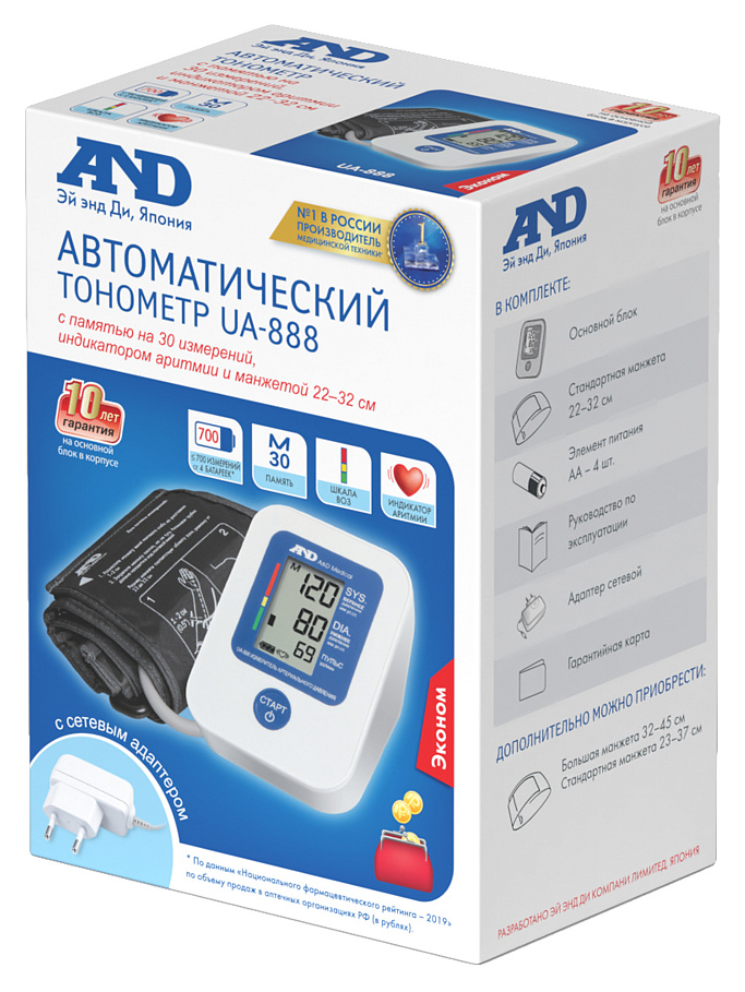 - Тонометр A&D UA-888 Эконом автоматический - 1 шт.