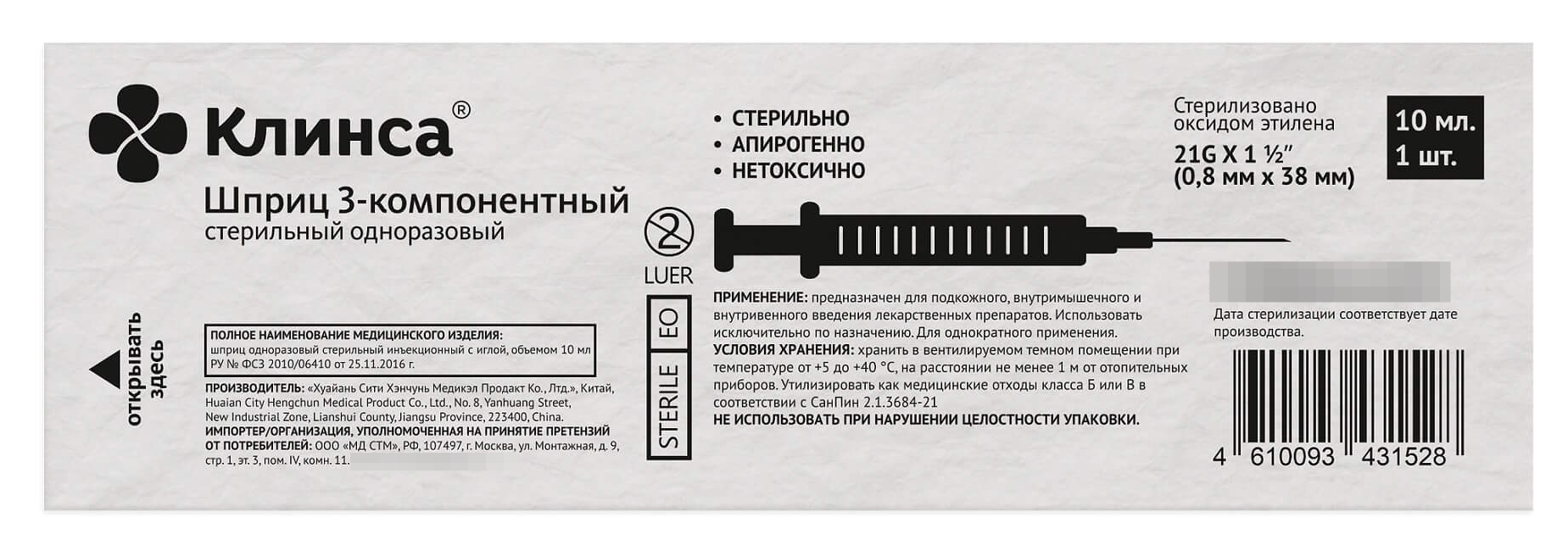Шприц одноразовый, трехкомпонентный Клинса предназначен для подкожных, внутримышечных и внутривенных инъекций. Медицинский шприц нетоксичный, апирогенный, стерильный.