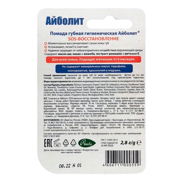Аванта Бальзам для губ питательный Айболит Sos-восстановление с маслом какао, ши, жожоба и витамином Е, от 6 месяцев 2.8г / гигиеническая помада