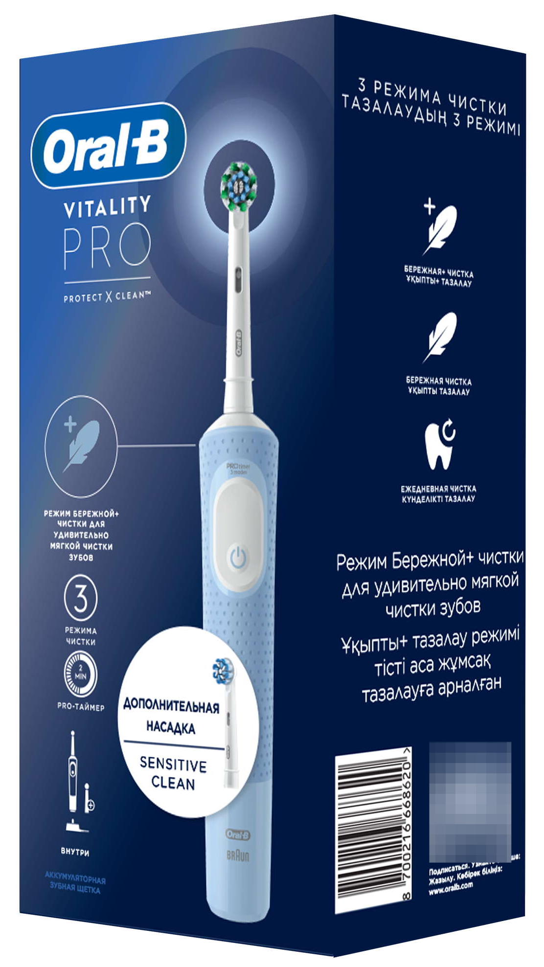Электрическая зубная щетка Oral-B / Орал-Би Vitality Pro пластиковая голубого цвета, 3 режима, с зарядкой и сменными насадками Sensitive Clean 2шт. / для чистки зубов