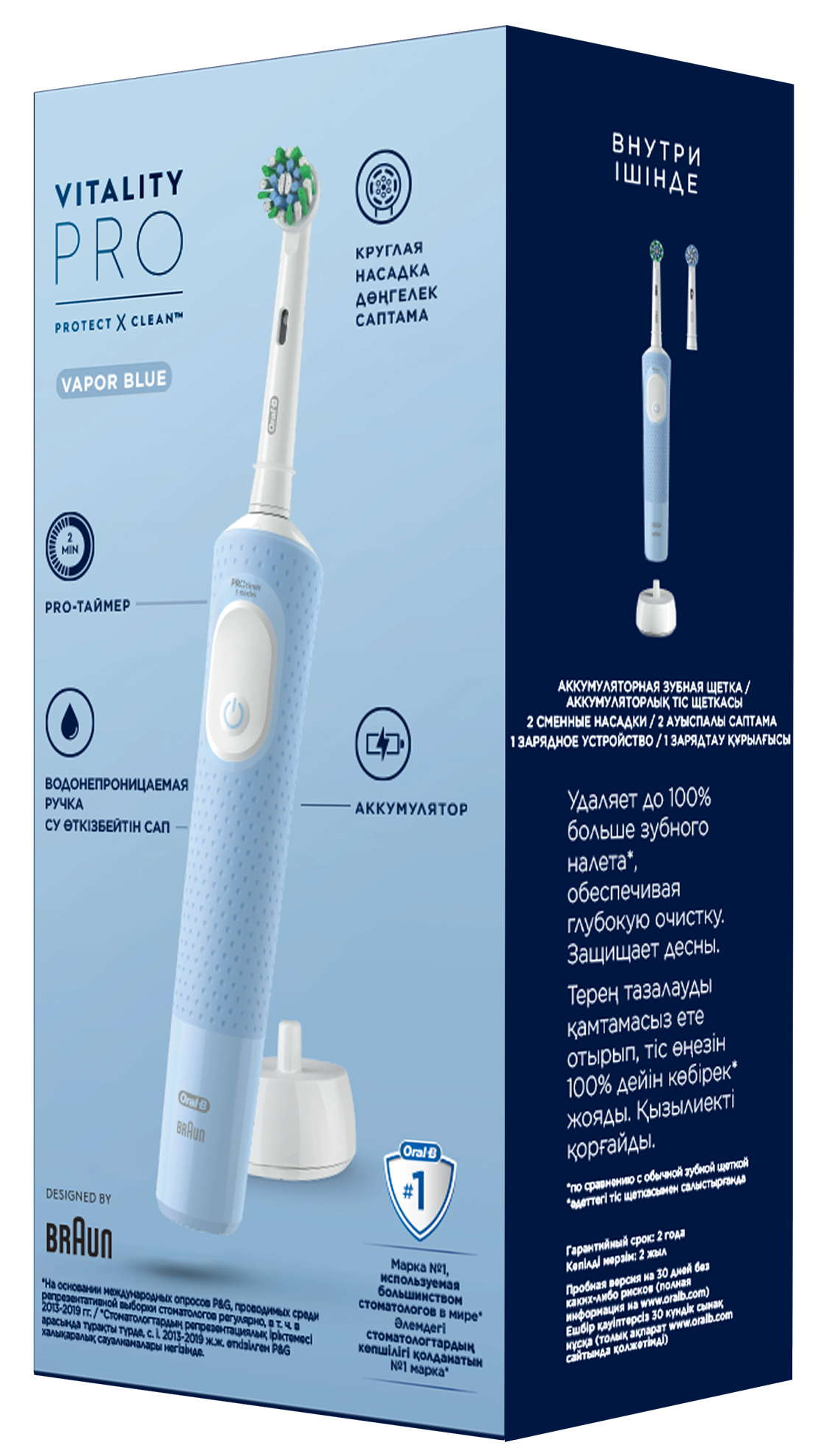 Oral-B Vitality PRO удаляет до 100% больше налета, а встроенный таймер оповестит вас о завершении 2-х минутной процедуры чистки. В наборе голубая щетка Oral-B Vitality Pro и 2 сменные насадки.