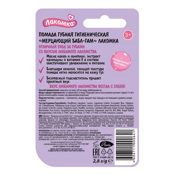 Он защищает сухие, потрескавшиеся или обветренные губы. Смягчающие свойства делают бальзам для губ Лакомка Мерцающий Бабл-гам идеальным увлажняющим средством. Благодаря высокому содержанию жирных кислот масло какао способствует формированию водно-липидного слоя, защищающего кожу от воздействия внешней среды. В результате кожа легче адаптируется к резким погодным условиям: морозу, ветру и жаре.