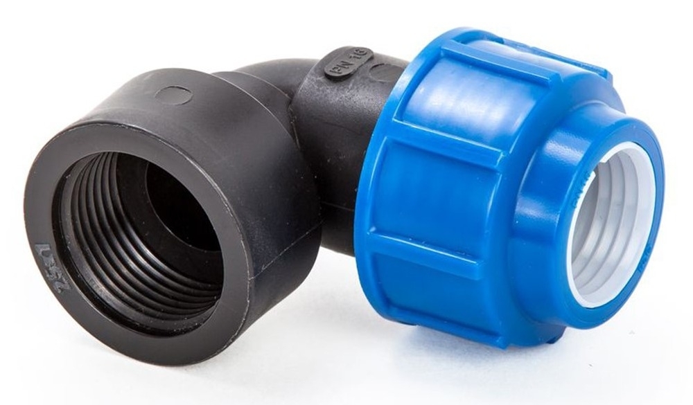 Отвод компрессионный с внутренней резьбой для устройства надежного поворота трубопровода при строительстве систем питьевого или технического водоснабжения, систем полива, систем напорной канализации, при строительстве систем водоотведения. Служит для перехода с трубы ПНД на внутреннее резьбовое соединение крана, тройника и прочих фасонных изделий под углом 90 градусов.