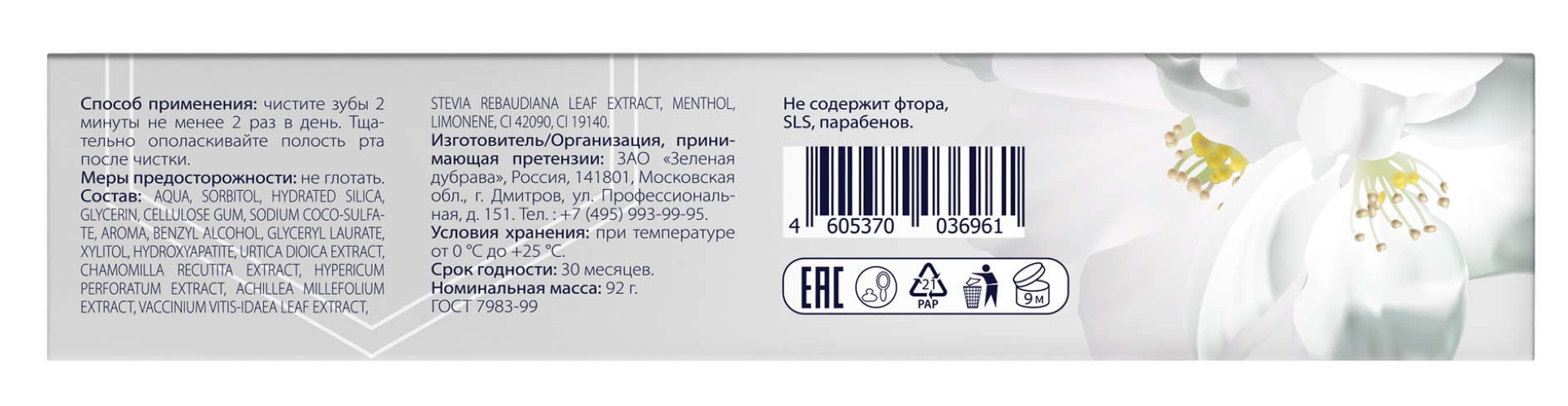 - Паста отбеливающая зубная содержит: Aqua, Sorbitol, Hydrated Silica, Glycerin, Cellulose Gum, Sodium Coco-Sulfate, Aroma, Benzyl Alcohol, Glyceryl Laurate, Xylitol, Hydroxyapatite, Urtica Dioica Extract, Chamomilla Recutita Extract, Hypericum Perforatum …