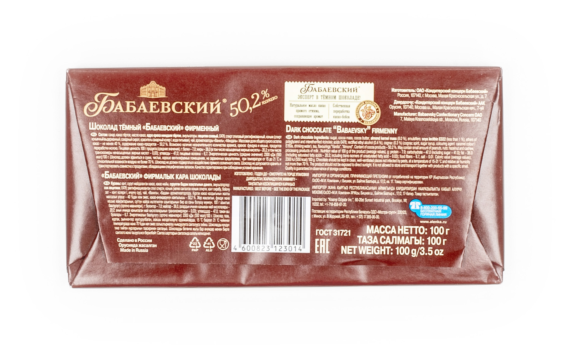 Шоколад темный Бабаевский — традиционный молочный шоколад. Плитка прямоугольной формы отличается темно-коричневым оттенком со слегка блестящей поверхностью. Лакомство имеет твердую однородную консистенцию без вкраплений и ярким аромат.