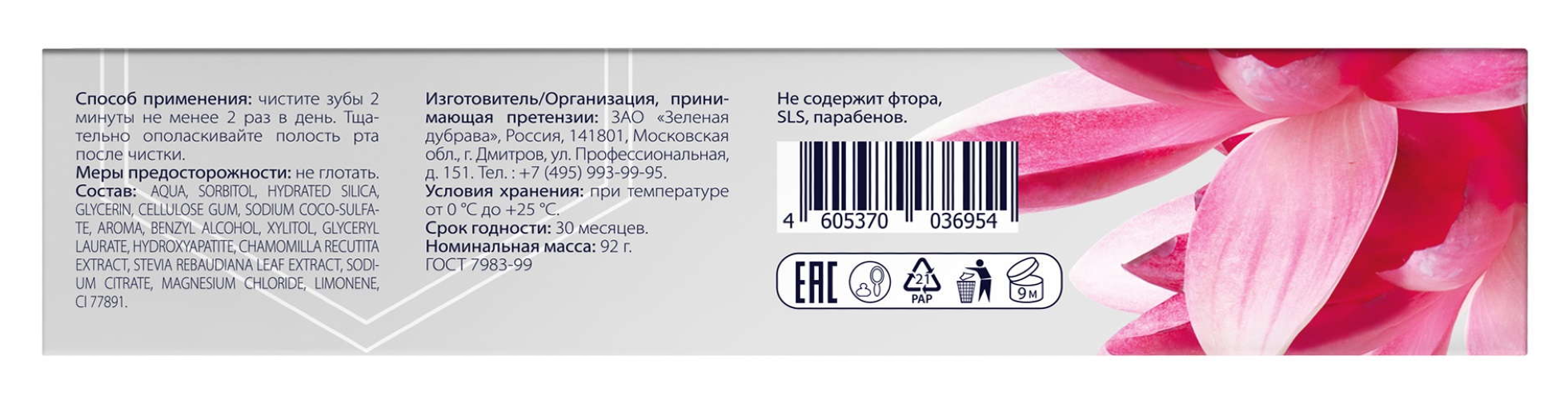 - Паста отбеливающая зубная содержит: Aqua, Sorbitol, Hydrated Silica, Glycerin, Cellulose Gum, Sodium Coco-Sulfate, Aroma, Benzyl Alcohol, Xylitol, Glyceryl Laurate, Hydroxyapatite, Chamomilla Recutita Extract, Stevia Rebaudiana Leaf Extract, Sodium Citra…