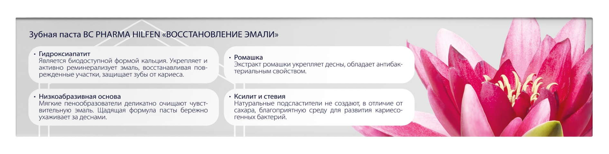 Зубная паста «Восстановление эмали» с гидроксиапатитом укрепляет и реминерализует эмаль, насыщает ткани зубов кальцием. Гидроксиапатит - натуральная биодоступная форма кальция. По структуре и составу он похож на естественную эмаль зубов, поэтому легко встраивает ионы кальция в ткани зуба, способствует защите от кариеса, возвращает зубам естественную белизну. Низкоабразивная основа и мягкие пенообразователи нежно, но тщательно очищают поврежденную и чувствительную эмаль. Экстракт ромашки устраняет раздражение и воспаление десен, снижая чувствительность. Ксилит и стевия - натуральные подсластители, которые препятствуют развитию кариесогенных бактерий. Паста не содержит фтора, парабенов и SLS.