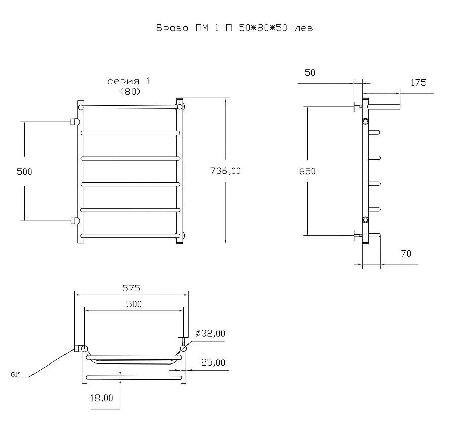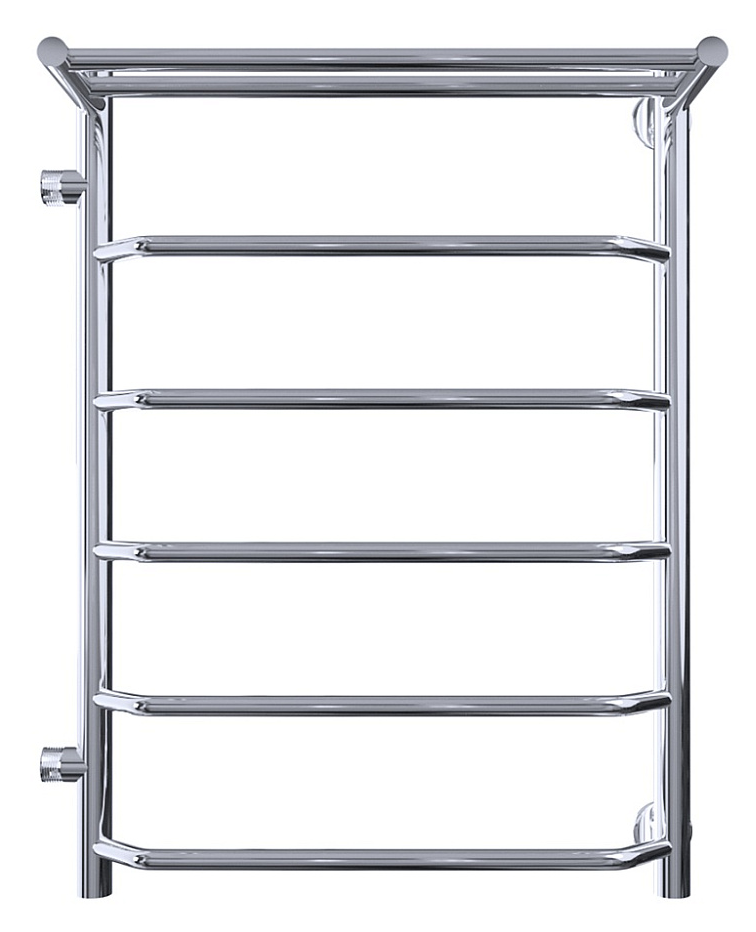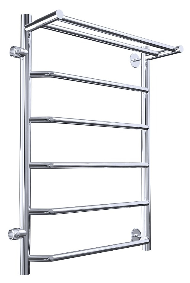 Водяной полотенцесушитель из серии «Браво» ПМ 1 П. На изделии размещены 5 перекладин трапецевидной формы, размещенных на одинаковом друг от друга расстоянии, а также полка. Ориентация левая, направление подключения горизонтальное.