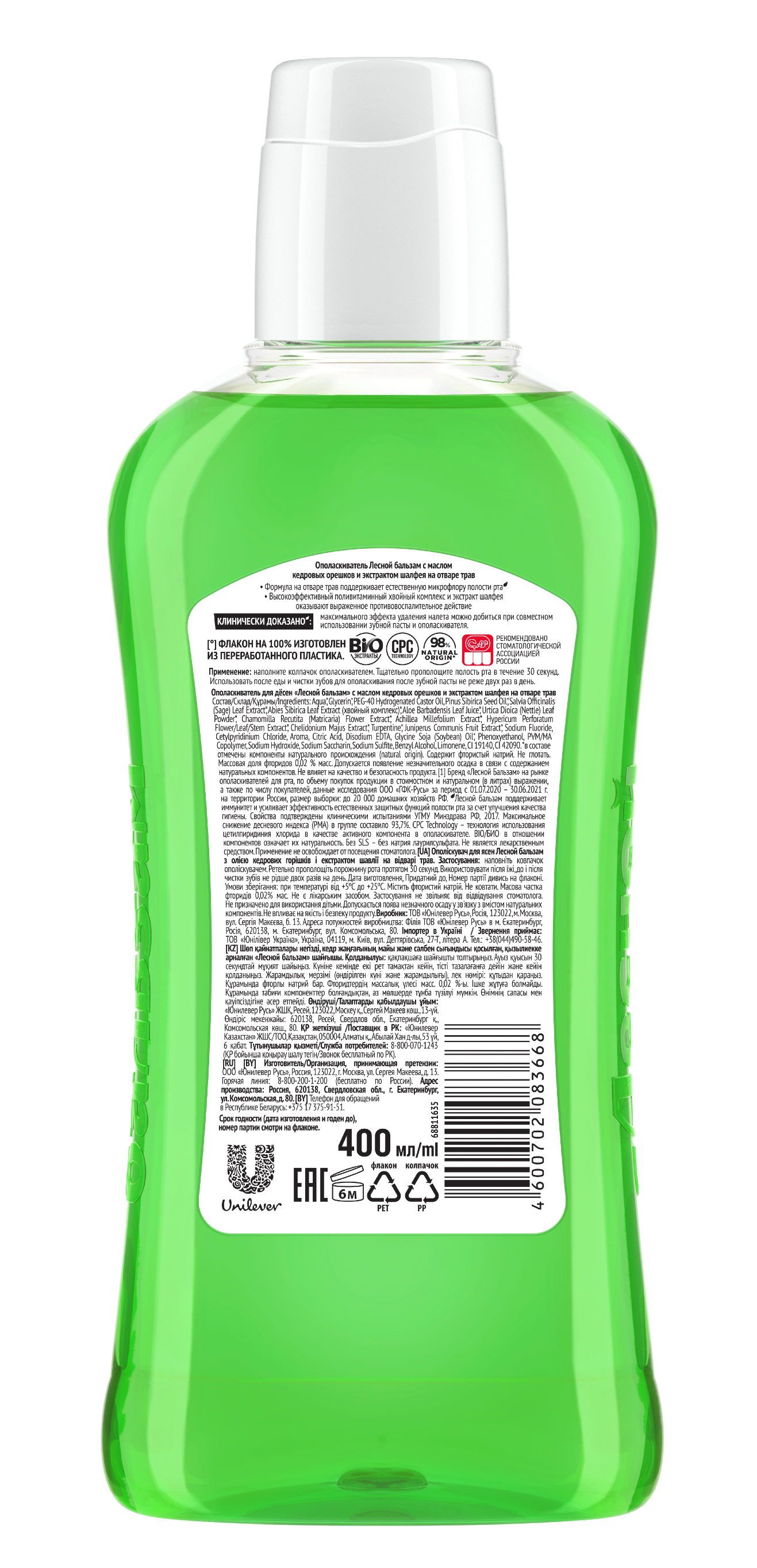 Продукт реализуется в удобном флаконе объемом 400 мл. Ополаскиватель для полости рта Лесной бальзам изготавливается из высококачественных и безопасных компонентов, не содержит парабенов и спирта. Рекомендован к ежедневному использованию после еды, до и после чистки зубов не реже двух раз.