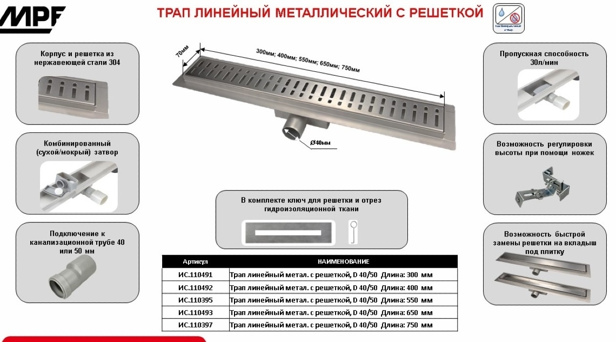 В комплекте: лотковый трап, решетка, ножки — 2 шт., гидроизоляционный материал, ключ для снятия решетки, переходник пластиковый для подключения к фановой трубе d40/50 мм.