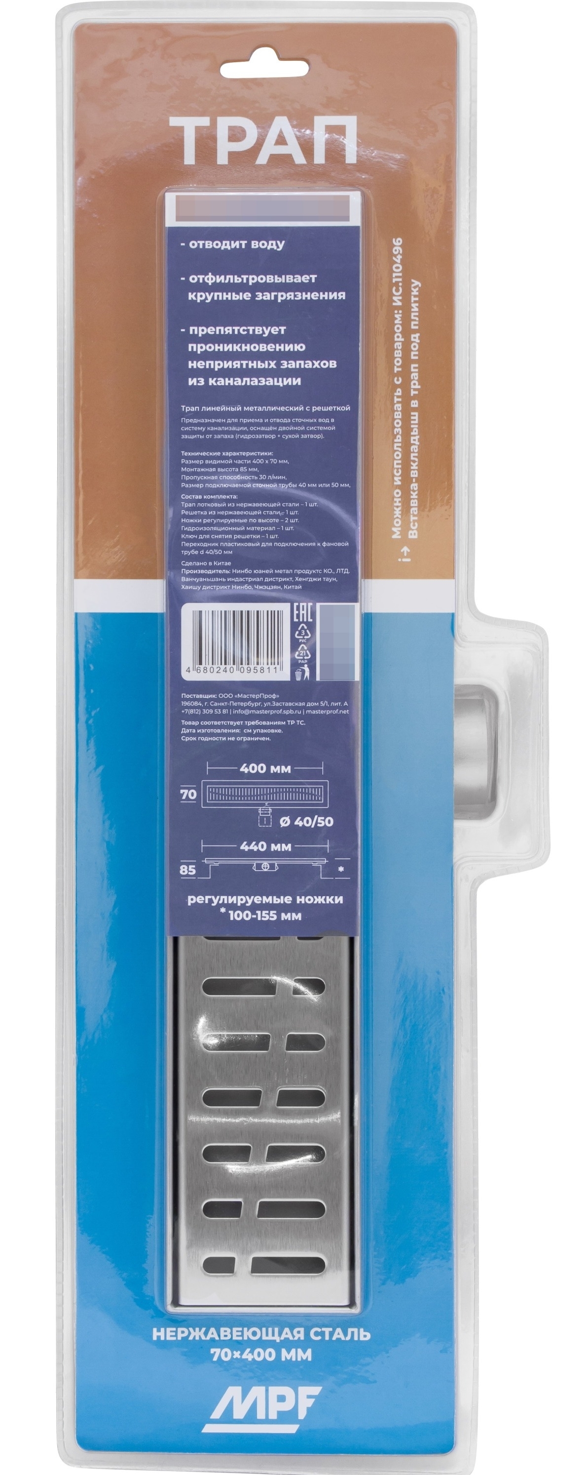 - Трап для душа Masterprof линейный, из нержавеющей стали с решеткой, диаметр 40/50мм, размером 7х40см - 1шт.