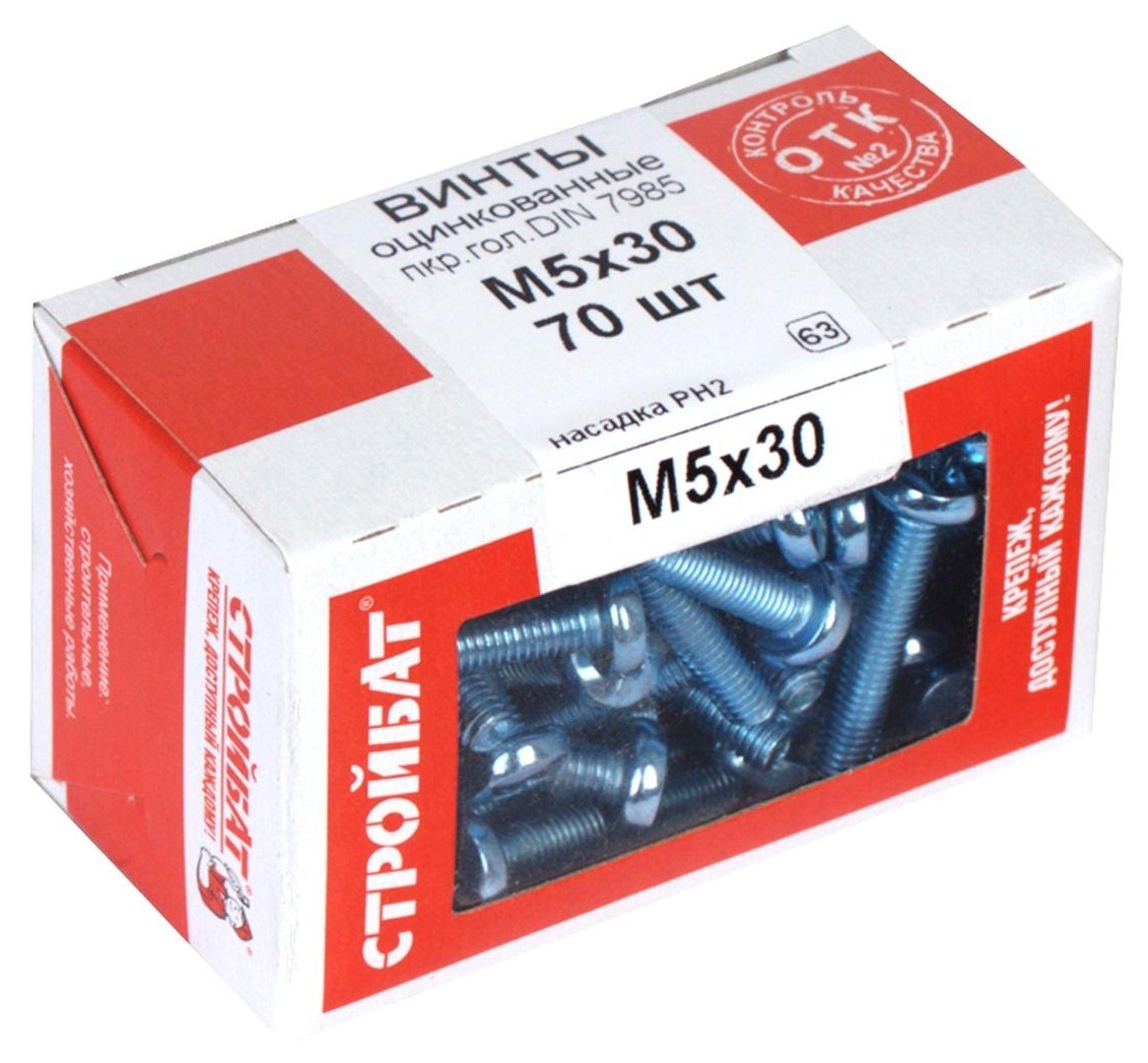 Винт реализуется в индивидуальной упаковке. Количество — 70 шт. Материал — сталь. Цвет — серый. Размер — 5×30 мм. Резьба — М5.