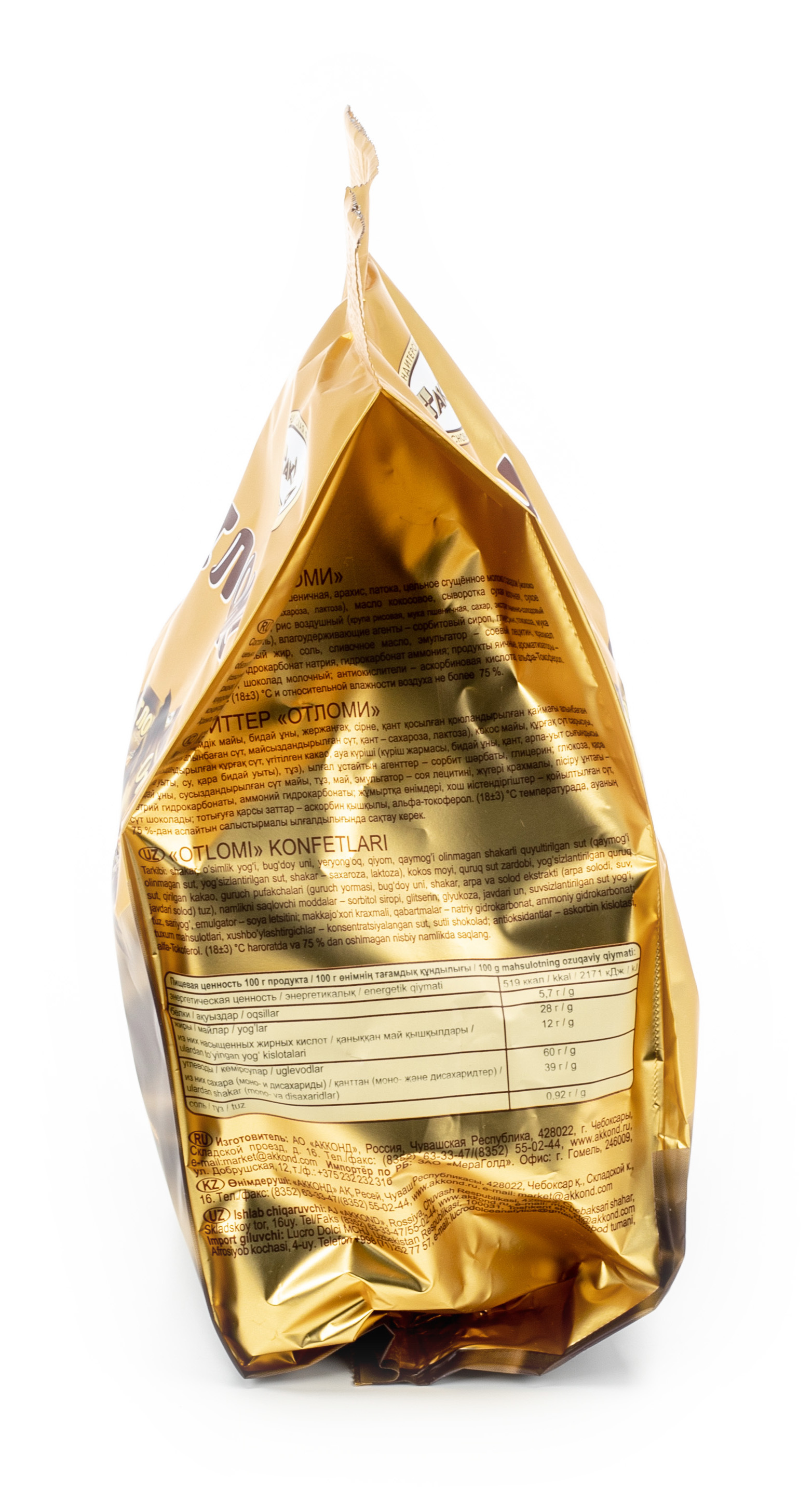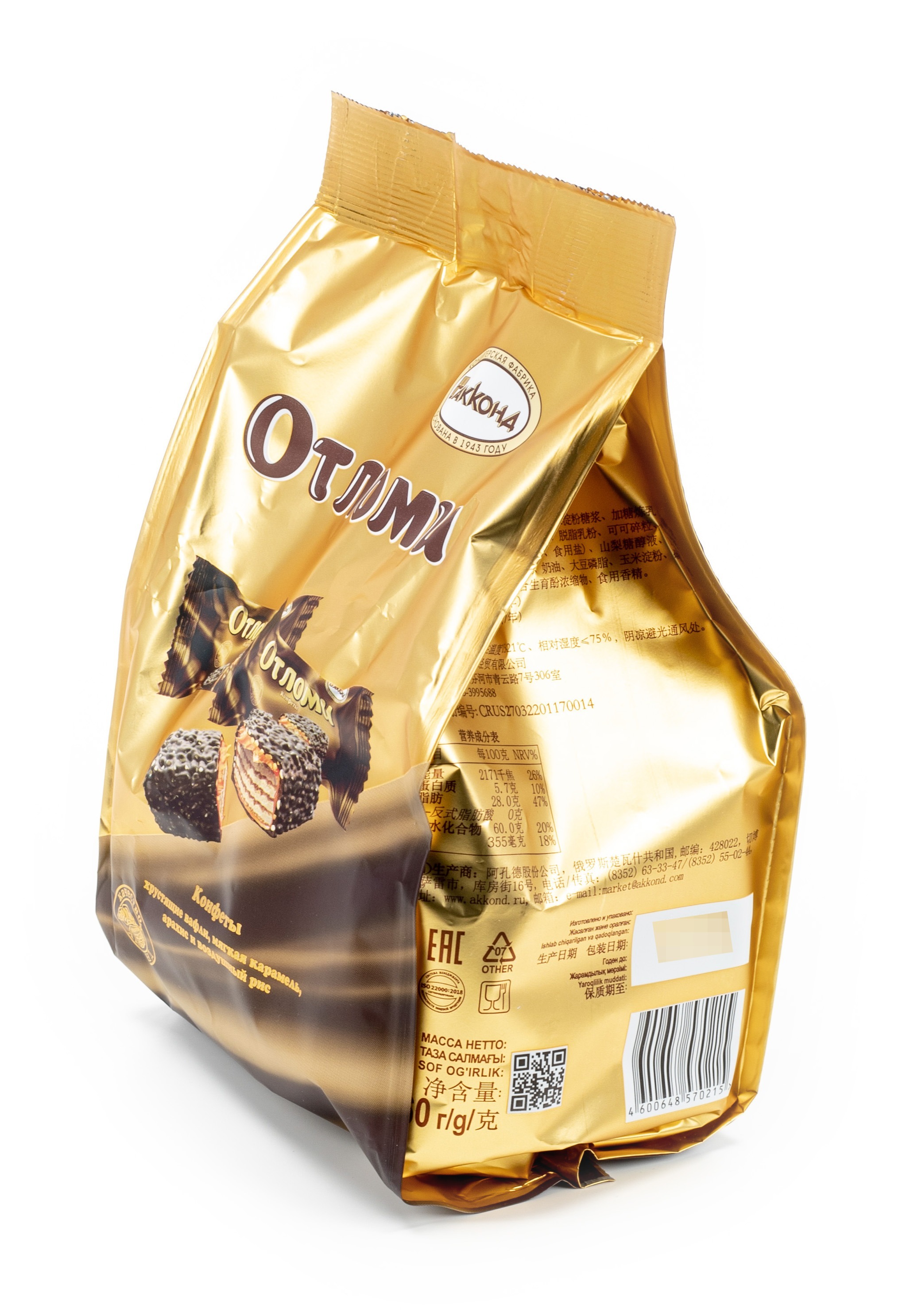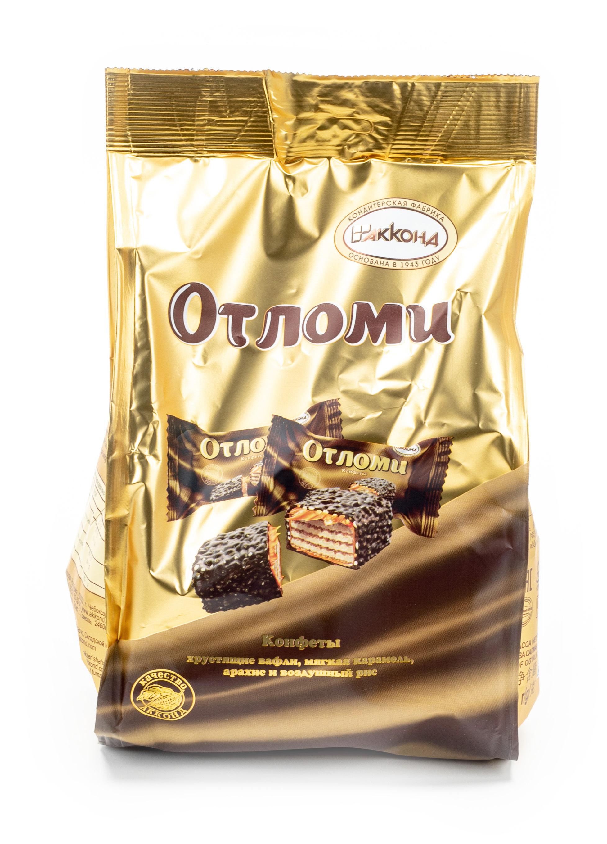 Конфеты Отломи от производителя Акконд оригинальные вафельные с молочной карамелью и кремовой начинкой, посыпанные крупкой арахиса и воздушным рисом, покрытые молочной шоколадной глазурью.