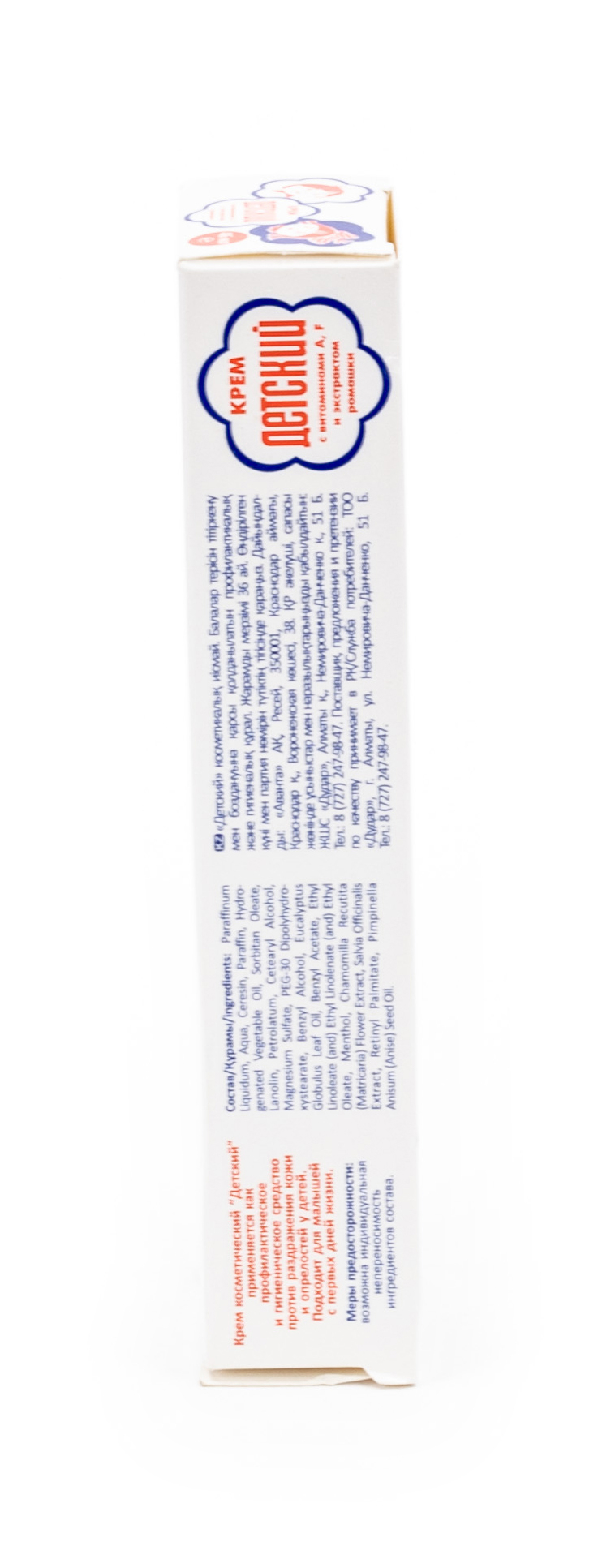 Крем детский с экстрактом ромашки содержит в своем составе: Paraffinum Liquidum, Aqua, Ceresin, Paraffin, Sorbitan Oleate, Hydrogenated Vegetable Oil, Lanolin, Magnesium Sulfate, Ethyl Linoleate (and) Ethyl Linolenate (and) Ethyl Oleate, Benzyl Acetate, Benzyl Alcohol, Eucalyptus Globulus Leaf Oil, Сhamomilla Recutita (Matricaria) Flowers Extract, Retinyl Palmitate, Menthol.