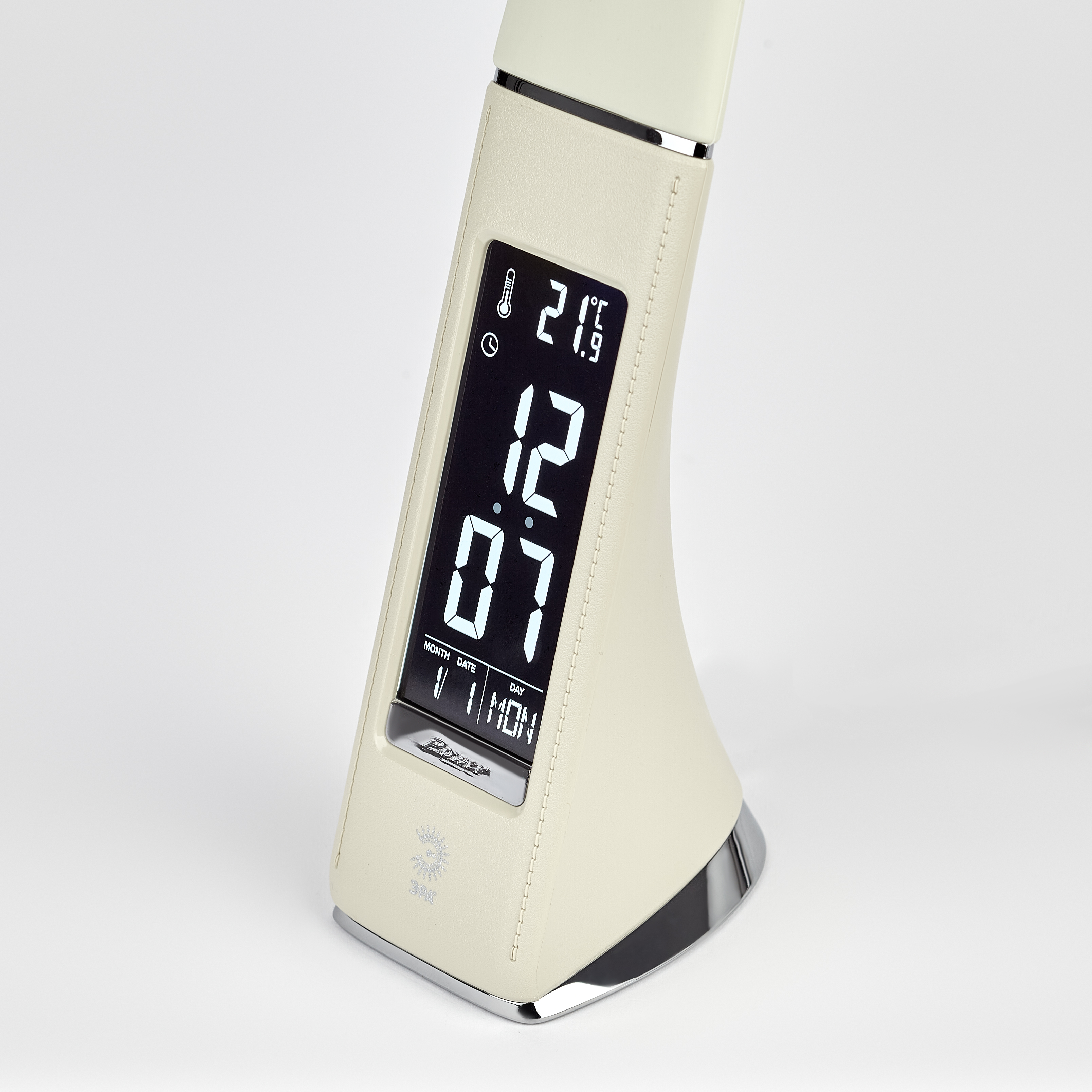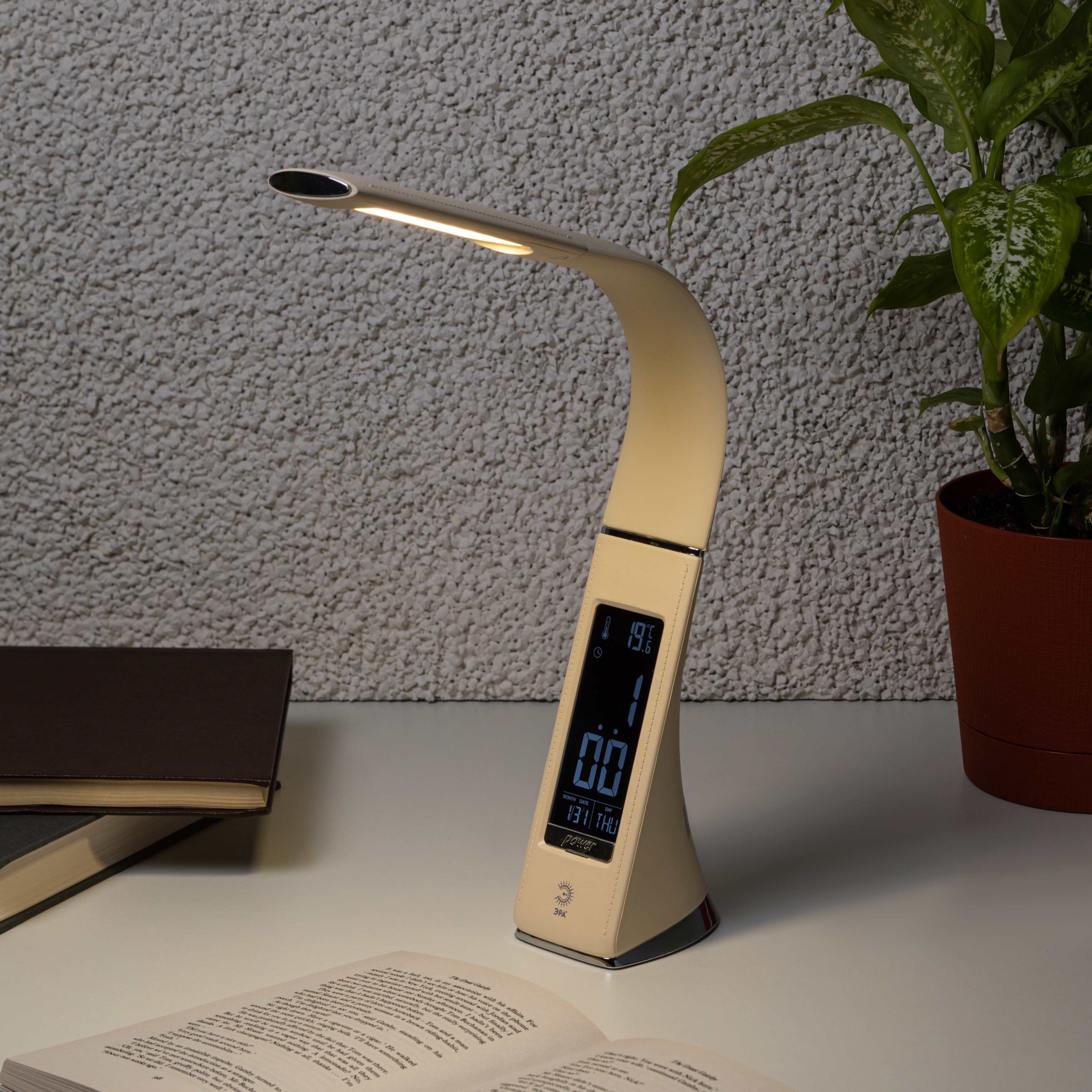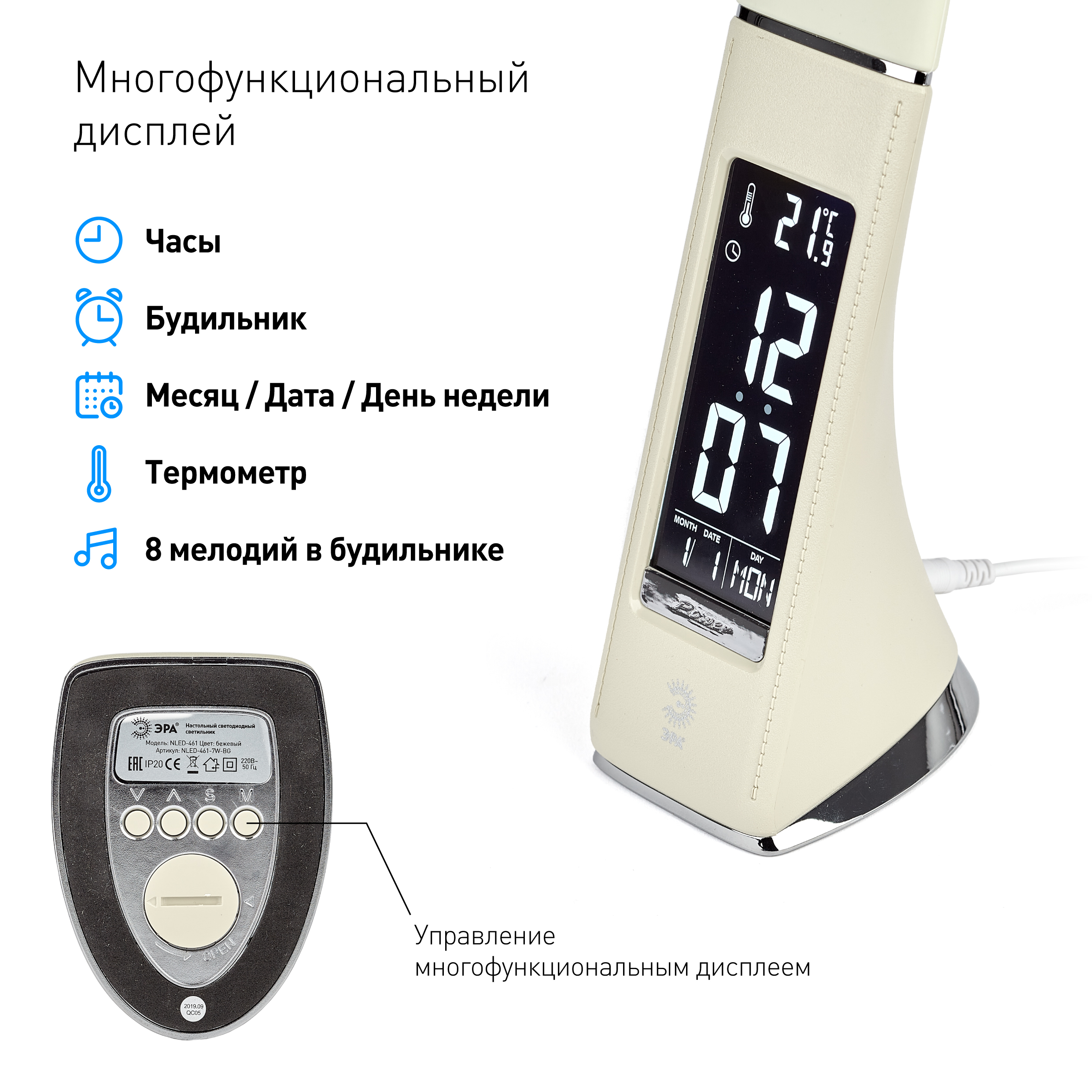 Главное преимущество светильника — ЖК дисплей с функциями часов, будильника, календаря и термометра.
