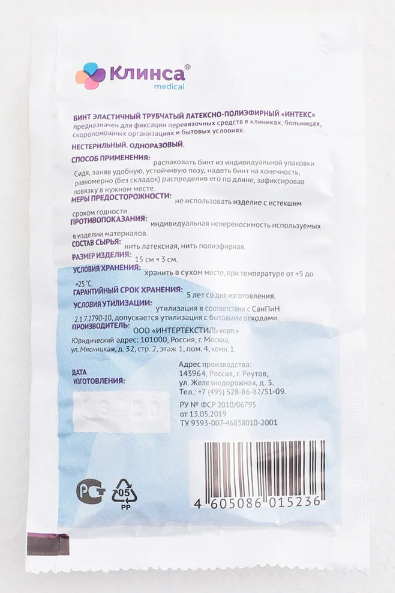 Нестерильный медицинский бинт Клинса Бинт медицинский нестерильный эластичный трубчатый латексно-полиэфирный 15х3 см №20