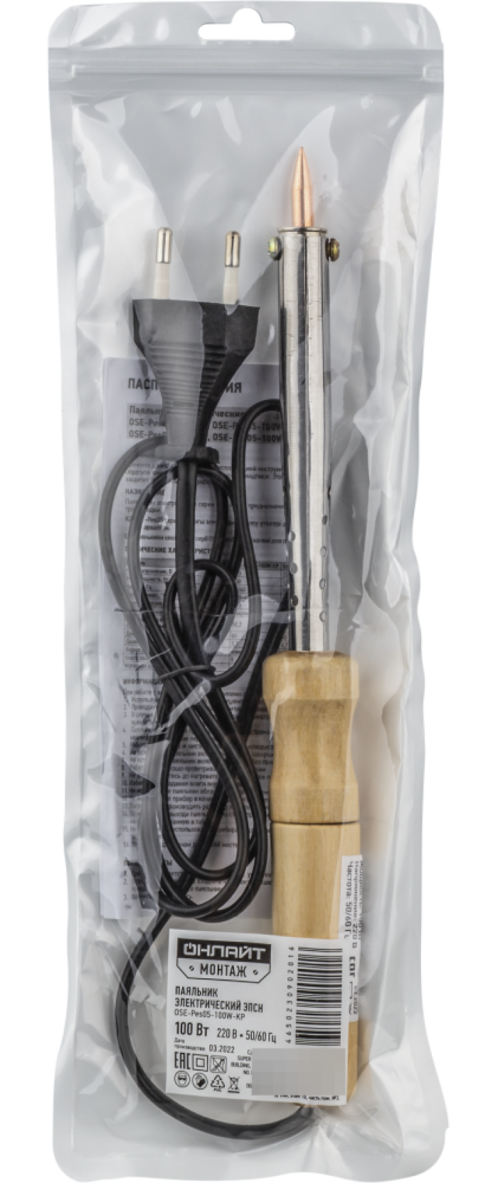 - Паяльник электрический ОНЛАЙТ OSE-Pes05-100W-KP с прямым конусом и деревянной рукояткой, 100Вт 220В, нагрев за 180с, 90201 - 1шт.