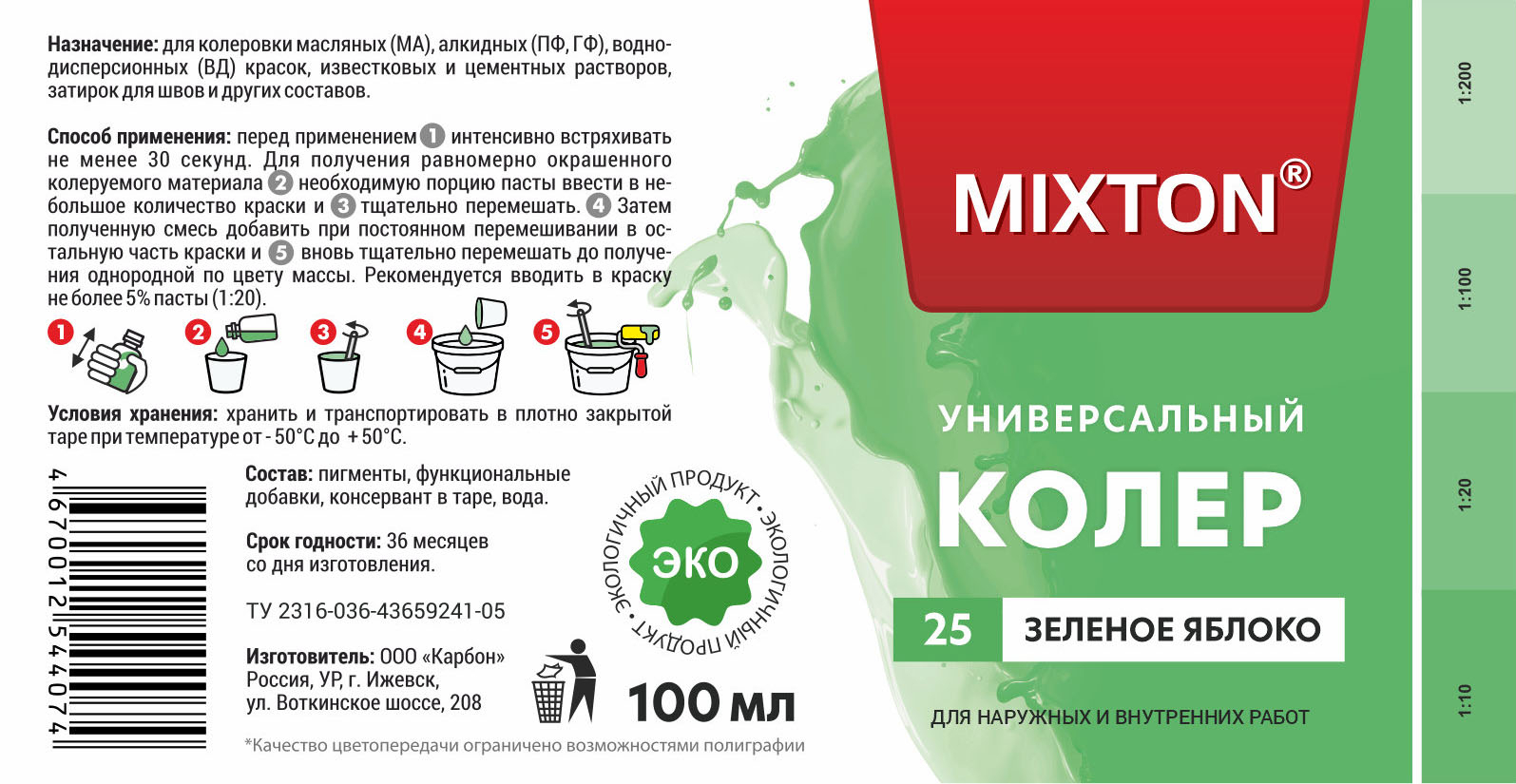 MIXTON — колер для краски, который гарантирует насыщенность и равномерное распределение пигмента. Благодаря особой формуле, продукт подходит как для интерьерных работ, так и для оформления фасадов. Просто добавьте его в базовый состав, и вы получите стойкий цвет.
