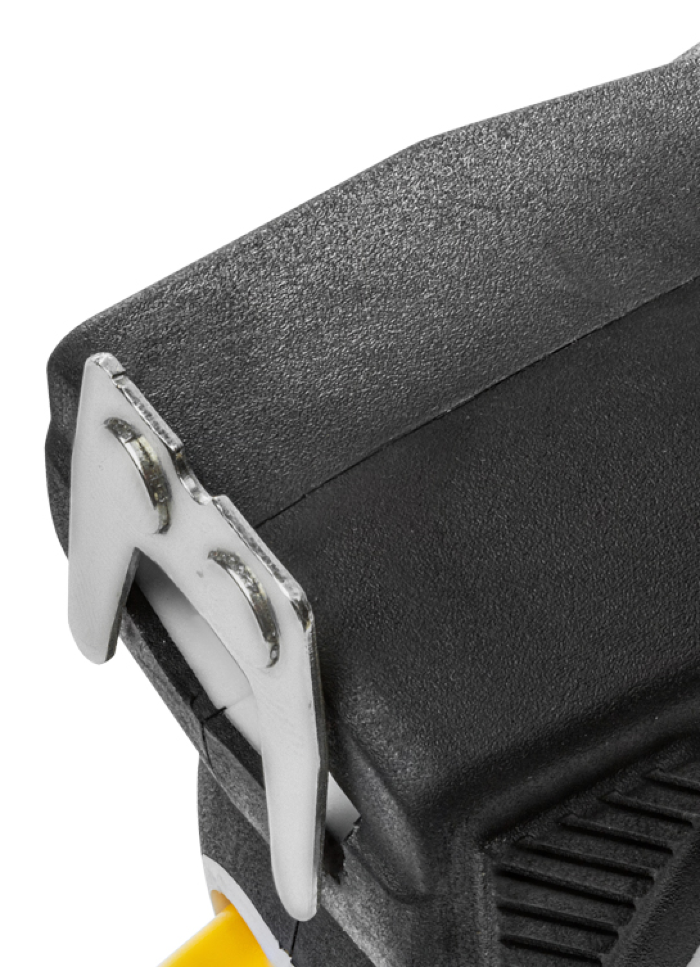 Двухкомпонентный прорезиненный корпус, выполненный из ударопрочного пластика, не скользит в руках. Закаленное двухстороннее толстое полотно может быть вытянуто на большую длину без изломов. Имеет глянцевое лаковое покрытие, которое не стирается со временем. Обладает удобным двухсторонним зацепом с мощными магнитами. Автоматическая лента бесшумно сматывается при нажатии на кнопку.