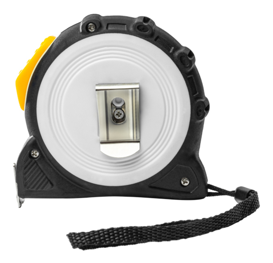 На корпусе расположена клипса-зажим для фиксации рулетки на ремне, кармане или поясной сумке. Ремешок позволяет надевать инструмент на запястье, чтобы освободить руки для работы.