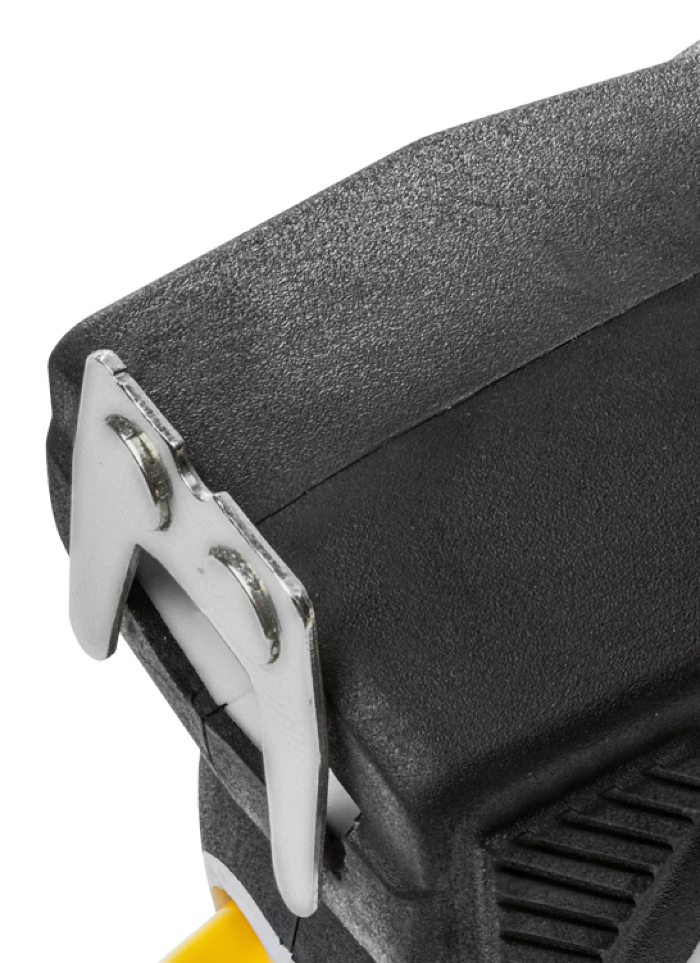 На корпусе расположена клипса-зажим для фиксации рулетки на ремне, кармане или поясной сумке. Ремешок позволяет надевать инструмент на запястье, чтобы освободить руки для работы.