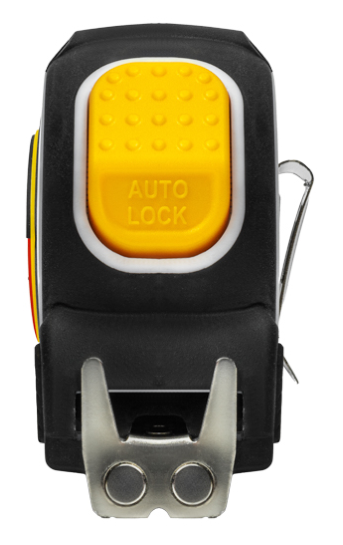 Двухкомпонентный прорезиненный корпус, выполненный из ударопрочного пластика, не скользит в руках. Закаленное двухстороннее толстое полотно может быть вытянуто на большую длину без изломов. Имеет глянцевое лаковое покрытие, которое не стирается со временем. Обладает удобным двухсторонним зацепом с мощными магнитами. Автоматическая лента бесшумно сматывается при нажатии на кнопку.