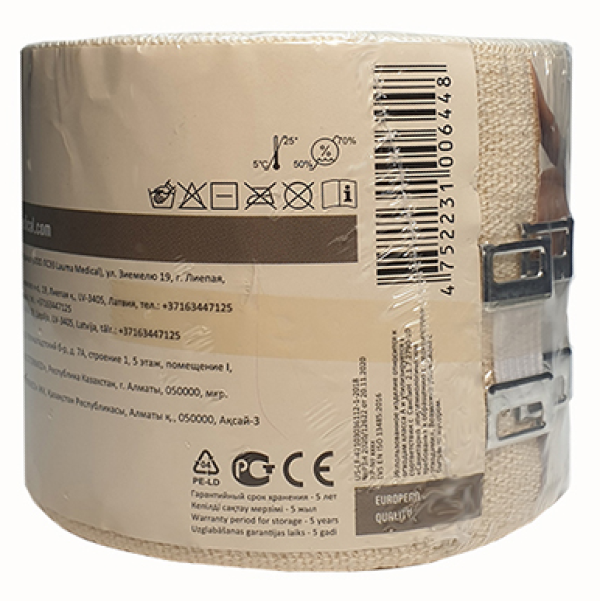 Представляет собой тканую эластичную ленту в цвете натурального сырья, определенной длины и ширины. Предназначен для накладывания на участки тела с целью их компрессии в различных превентивных/терапевтических целях.
