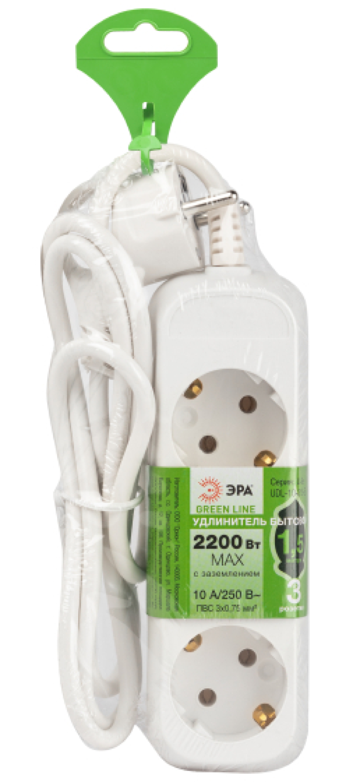 - Удлинитель бытовой ЭРА UDL-10-315-E Greenline с заземлением, ПВС 3х0.75мм², 1.5 метра, 3 розетки белый Б0064897 - 1шт.
