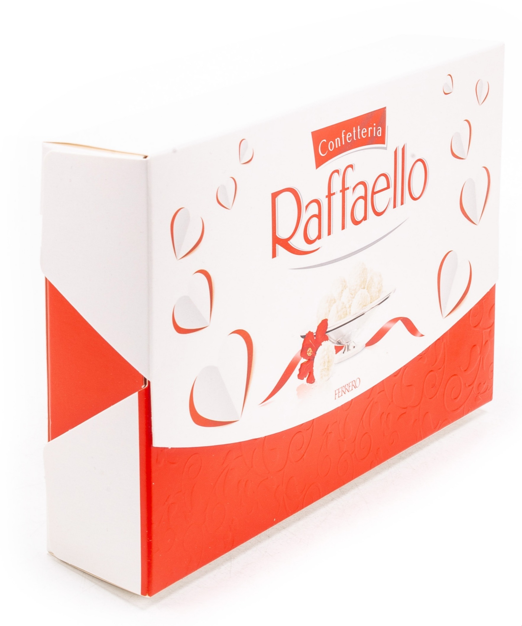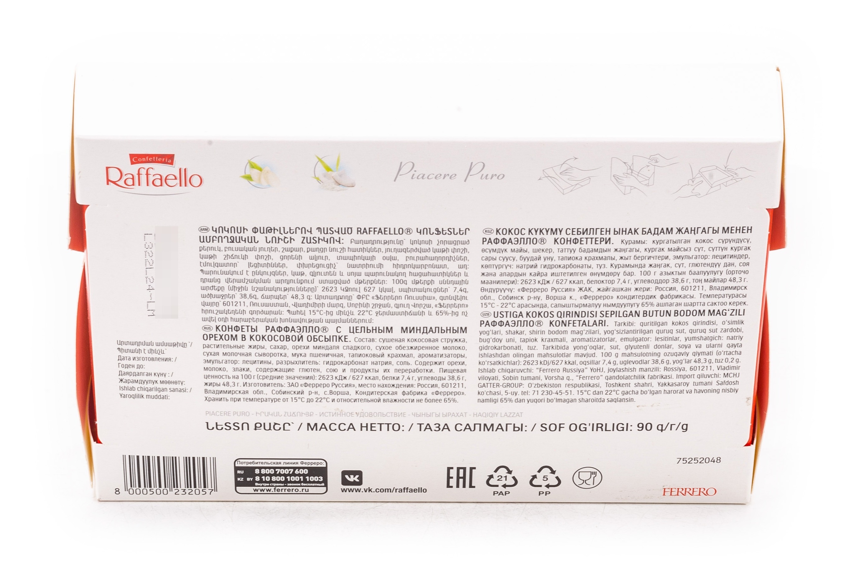Продукт реализуется в картонной упаковке весом 90 г. Конфеты Raffaello содержат в своем составе следующие компоненты: сушеная кокосовая стружка, растительные жиры, сахар, орехи миндаля сладкого, сухое обезжиренное молоко, сухая молочная сыворотка, мука пшеничная, тапиоковый крахмал, ароматизаторы, эмульгатор: лецитины, разрыхлитель: гидрокарбонат натрия, соль. Содержит орехи, молоко, злаки, содержащие глютен, сою и продукты их переработки.
