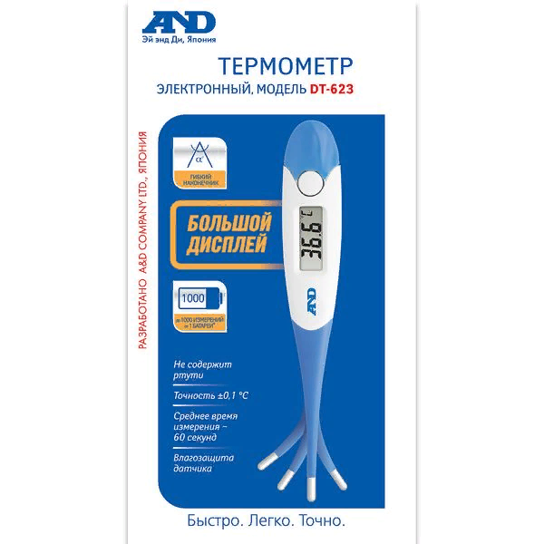 Термометр для тела AND / Эй энд Ди DT-623 без ртути цифровой водонепроницаемый, в пластиковом футляре / медицинский градусник электронный