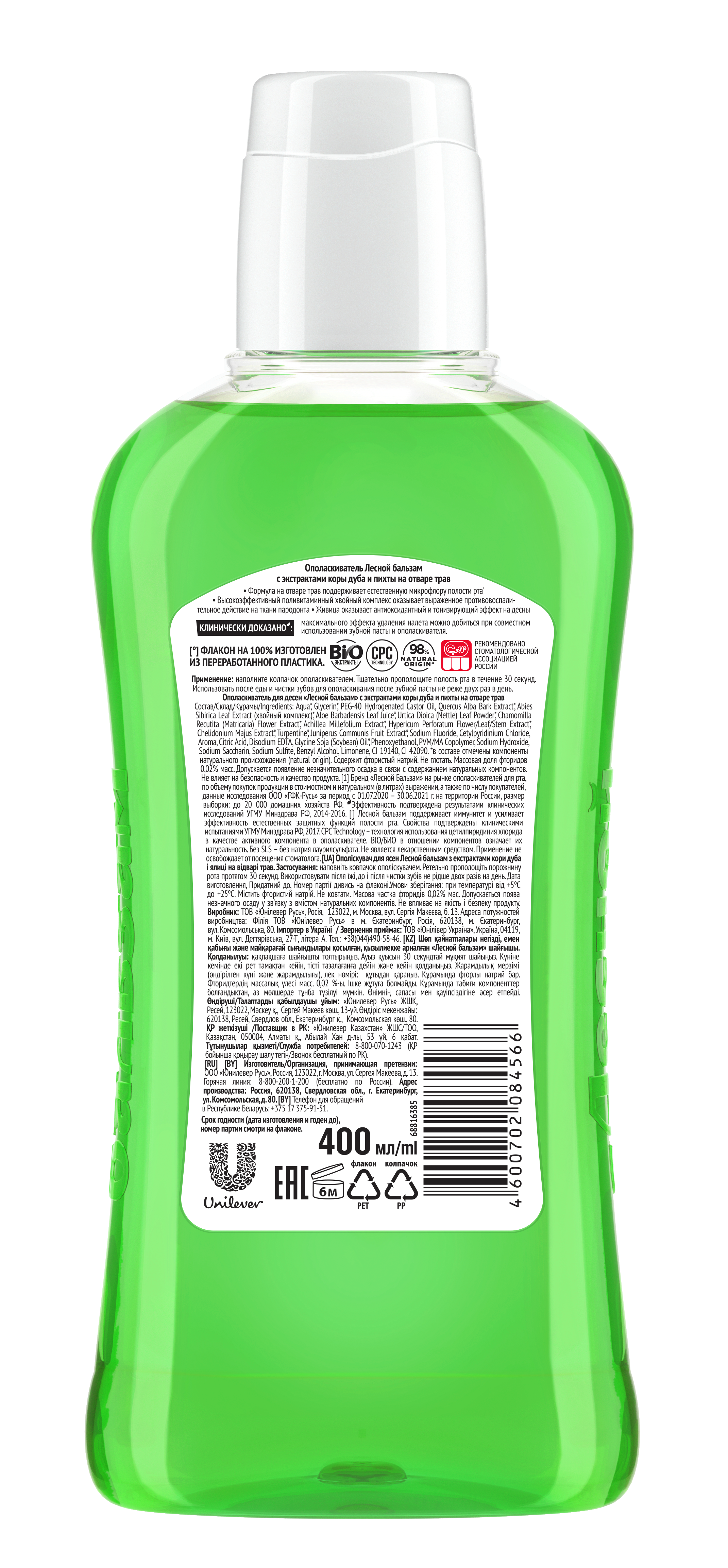 Продукт реализуется в удобном флаконе объемом 400 мл. Ополаскиватель для полости рта Лесной бальзам изготавливается из высококачественных и безопасных компонентов, не содержит парабенов и спирта. Рекомендован к ежедневному использованию после еды, до и после чистки зубов не реже двух раз.