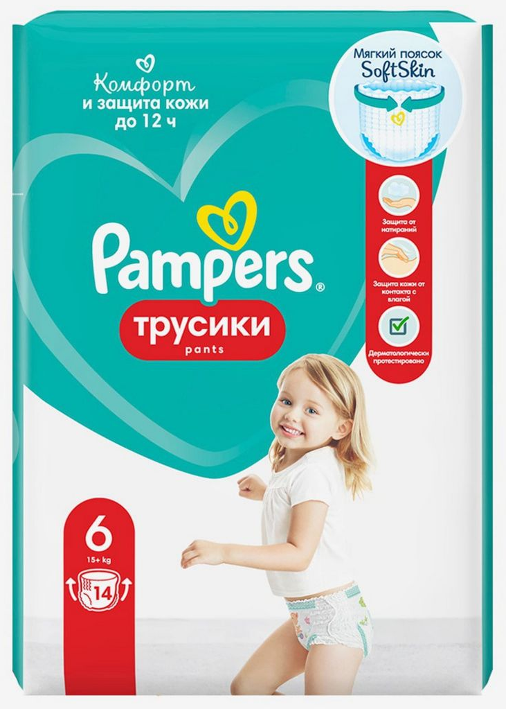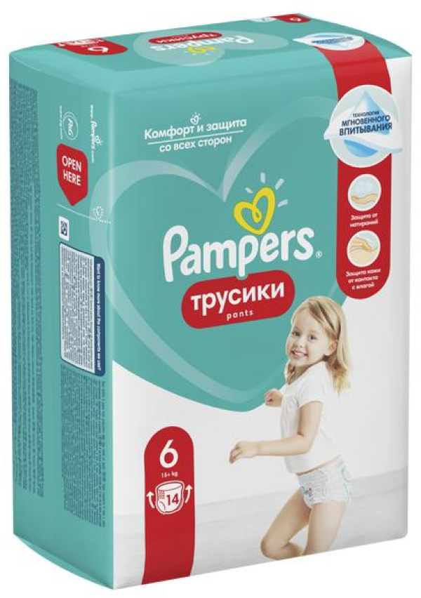 Трусики-подгузники Pampers Pants реализуются в индивидуальной упаковке. Размер — 6 (15+ кг). Изготавливаются с использованием самых безопасных материалов и технологий. Количество в упаковке — 14 шт.