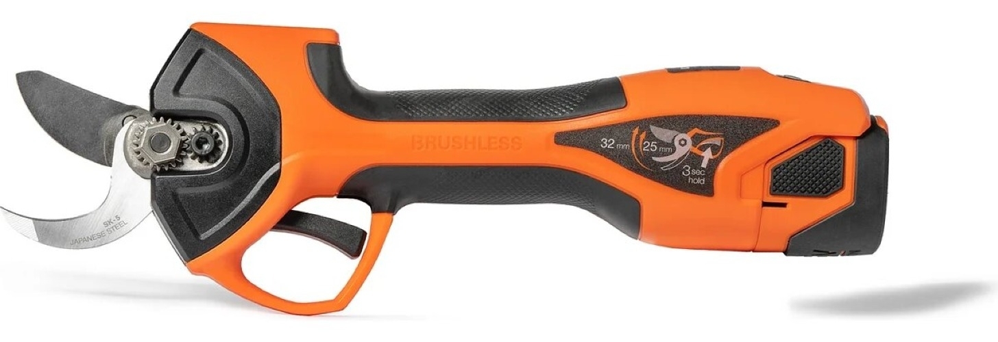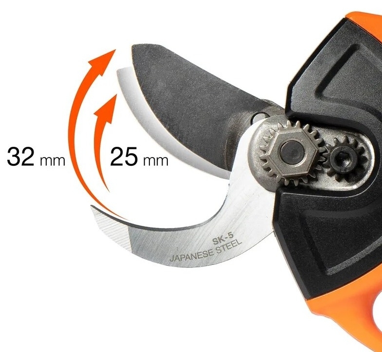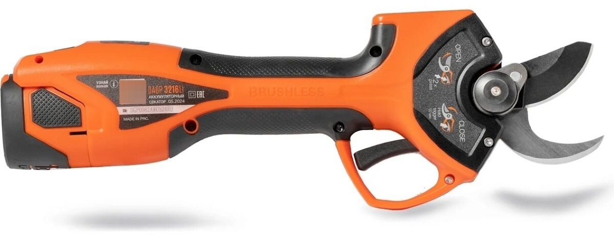 Секатор аккумуляторный DAEWOO DAGP 3216Li SET имеет высокую эффективность, оптимальную балансировку и эргономичную форму – все это обеспечивает легкую работу и предотвращает появление боли в руке, в отличие от работы с механическим секатором. Простое использование секатора обеспечивает функциональный рычаг управления. Благодаря ему вы быстро активируете секатор и измените угол раскрытия лезвий. Мощный бесщеточный электродвигатель обеспечивает высокую производительность и долгий срок службы секатора. Лезвия из японской углеродистой стали SK-5 с прецизионной заточкой справятся с самыми сложными задачами по обрезке, как молодых, так и сухих веток. У секатора есть регулировка угла раскрытия лезвий: 25 мм – для быстрых срезов и 32 мм – для толстых веток, цветов, кустарников, деревьев.