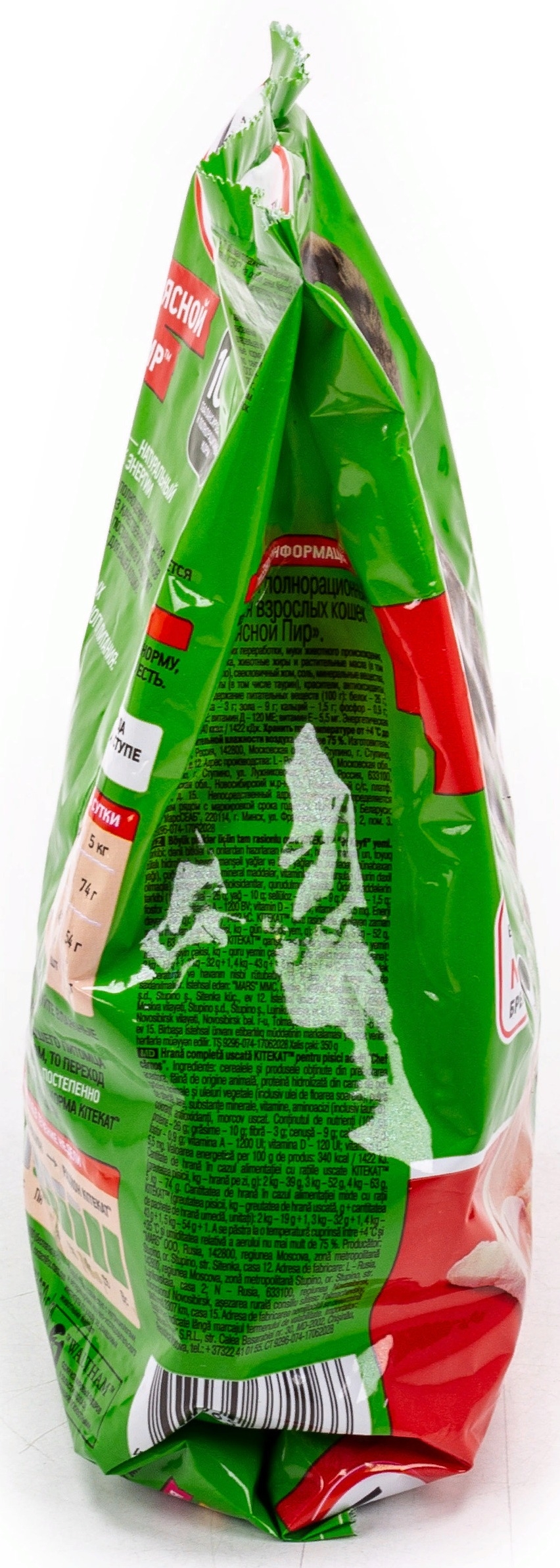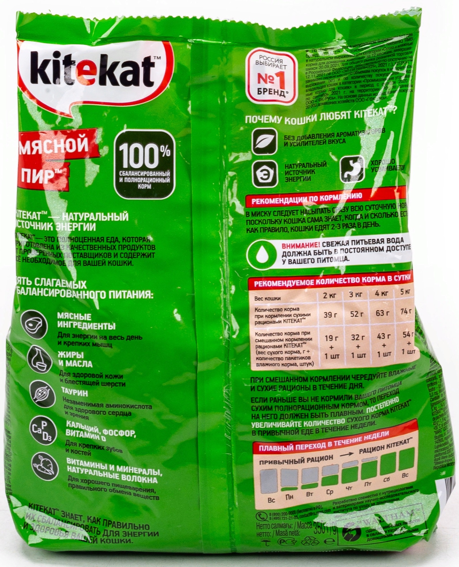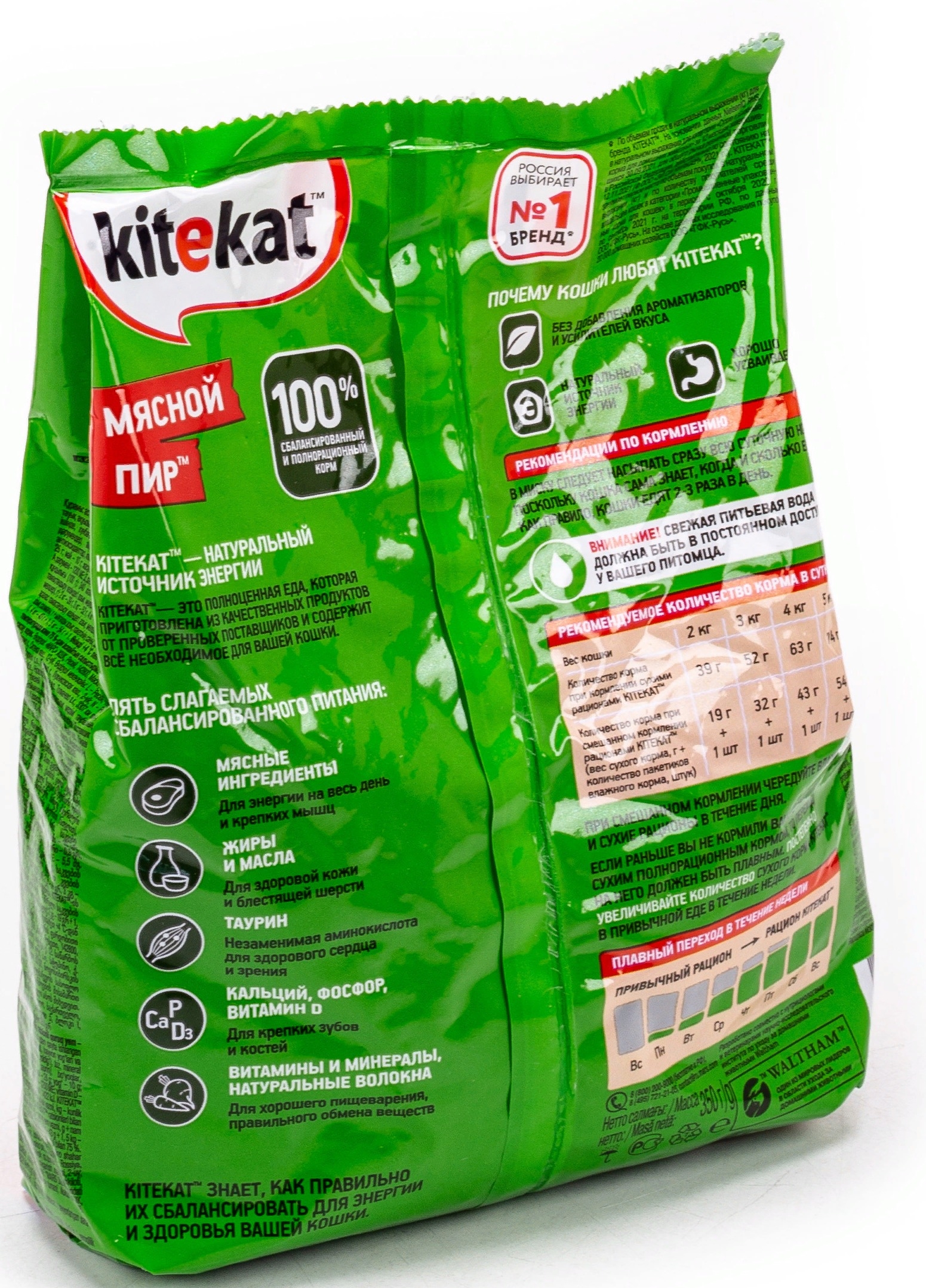 Корм для кошек Kitekat Мясной пир реализуется в индивидуальной упаковке — пакете. Содержит в своем составе: злаки и продукты их переработки, муку животного происхождения, гидролизат куриного белка, животные жиры и растительные масла (в том числе подсолнечное масло), свекловичный жом, соль, минеральные вещества, витамины, аминокислоты (в том числе таурин), красители, антиоксиданты, морковь сушёную.