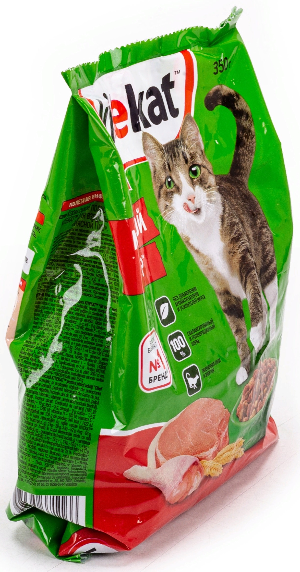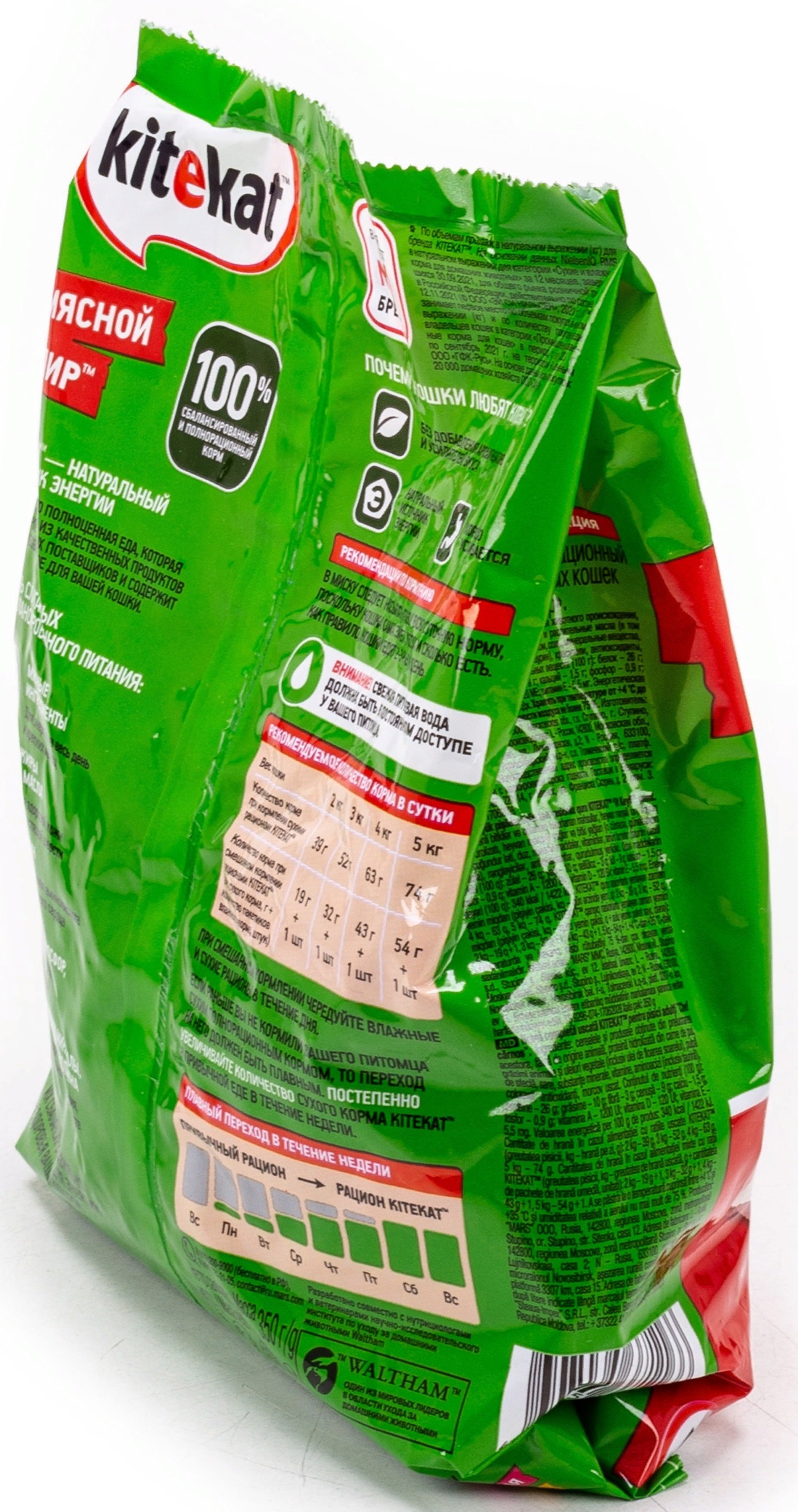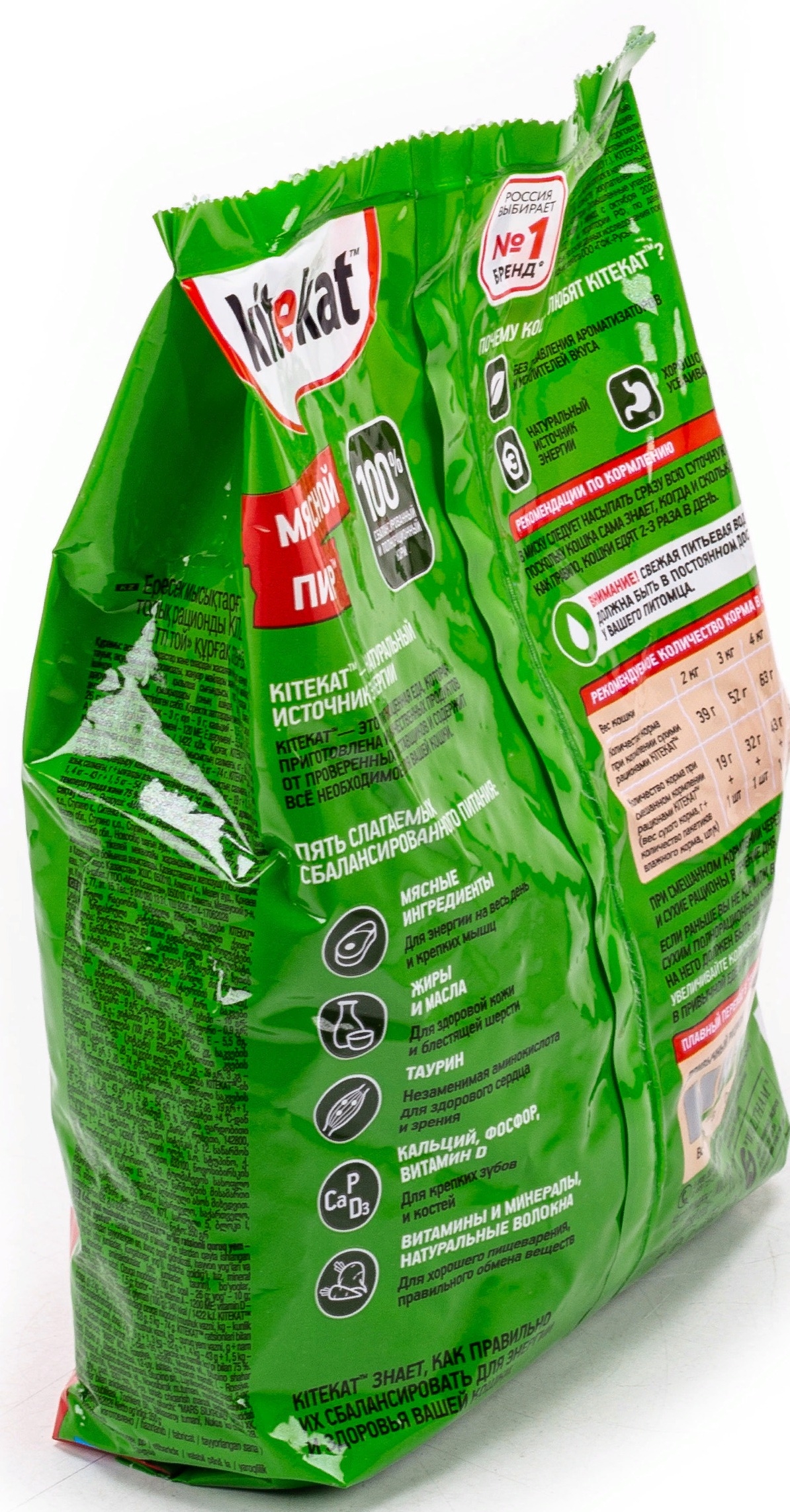 Корм для кошек Kitekat Мясной пир реализуется в индивидуальной упаковке — пакете. Содержит в своем составе: злаки и продукты их переработки, муку животного происхождения, гидролизат куриного белка, животные жиры и растительные масла (в том числе подсолнечное масло), свекловичный жом, соль, минеральные вещества, витамины, аминокислоты (в том числе таурин), красители, антиоксиданты, морковь сушёную.