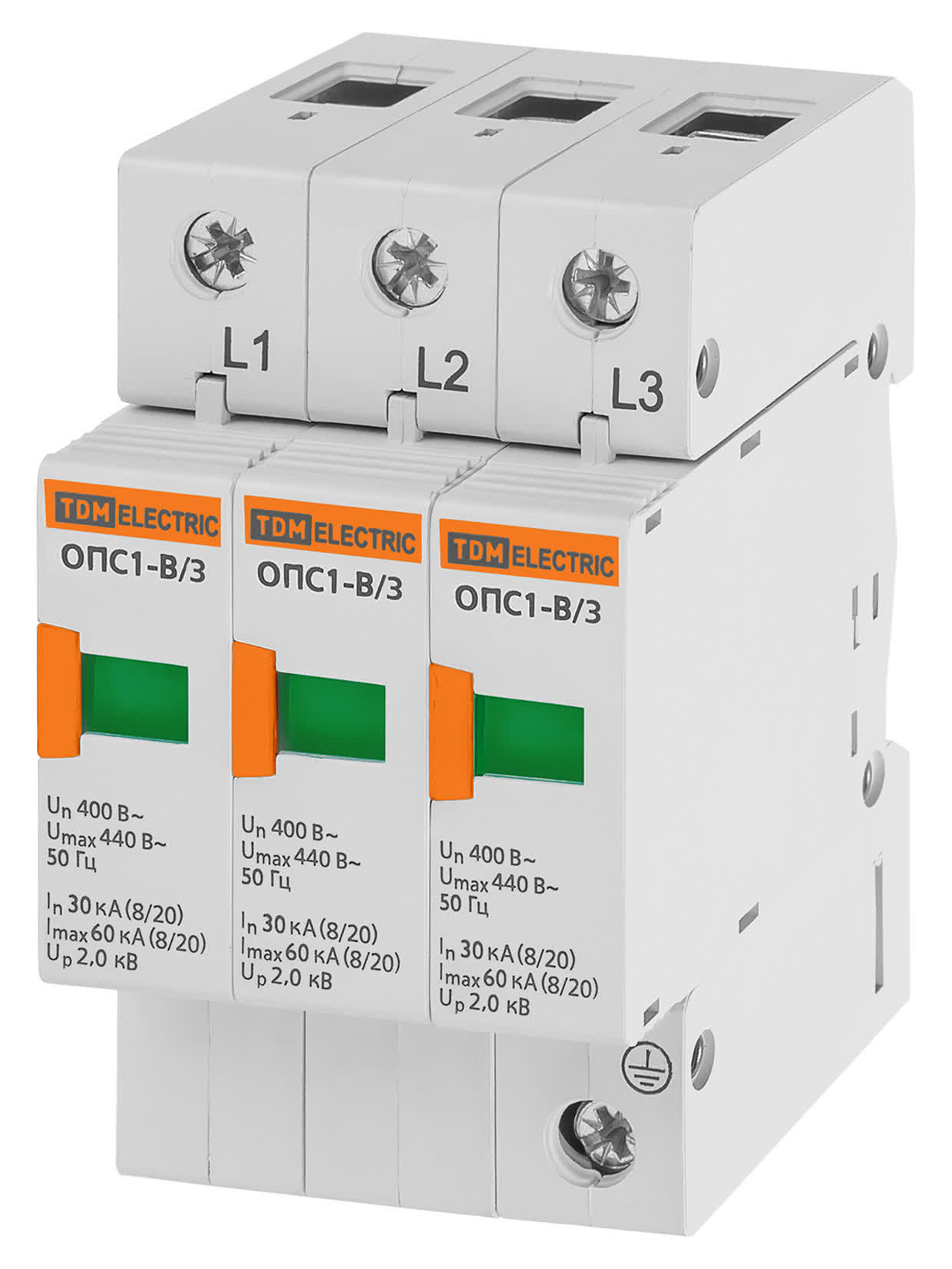 - Ограничитель перенапряжения TDM Electric ОПС1-B модульный, трехполюсной, 400В 30кА, 60кА, IP20 - 1шт.