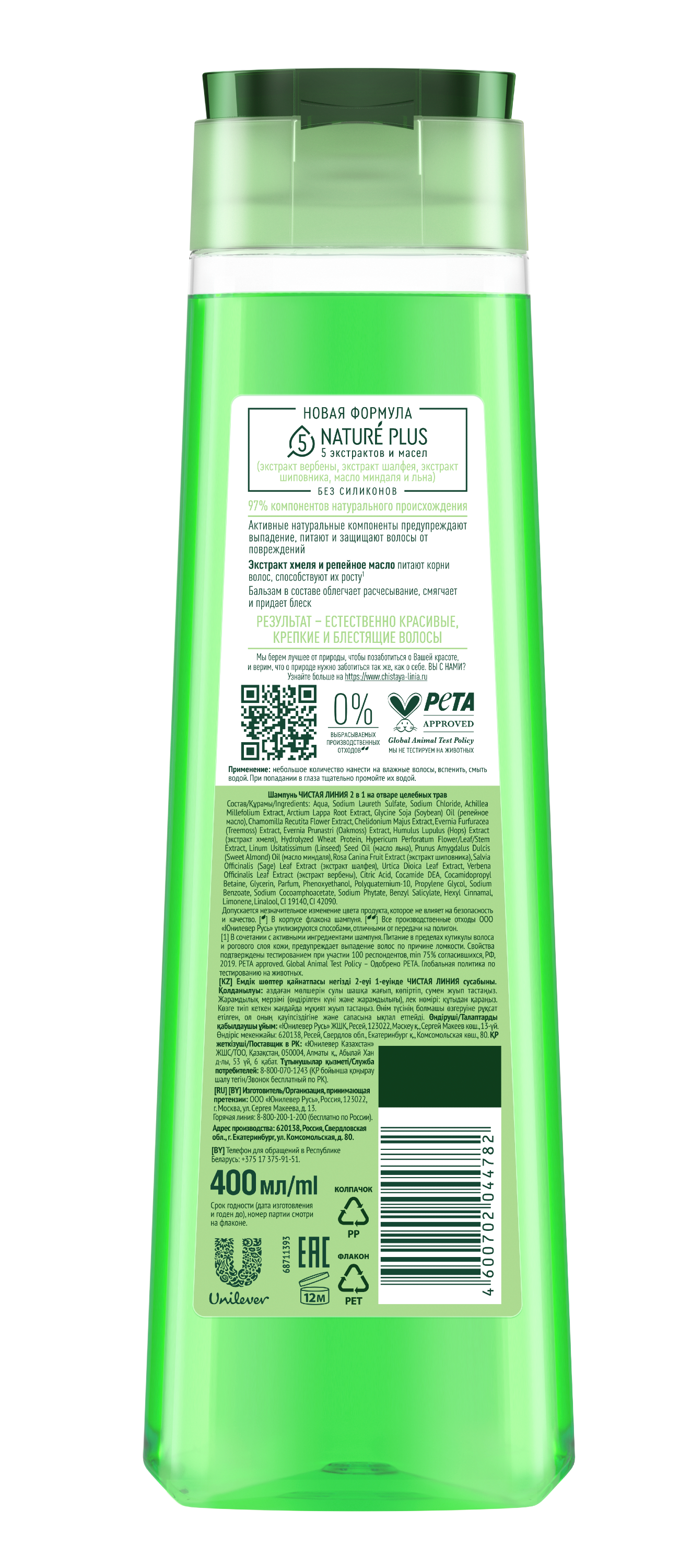 Чистая Линия Nature plus Шампунь-бальзам женский для всех типов волос с экстрактом хмеля и целебных трав 400мл
