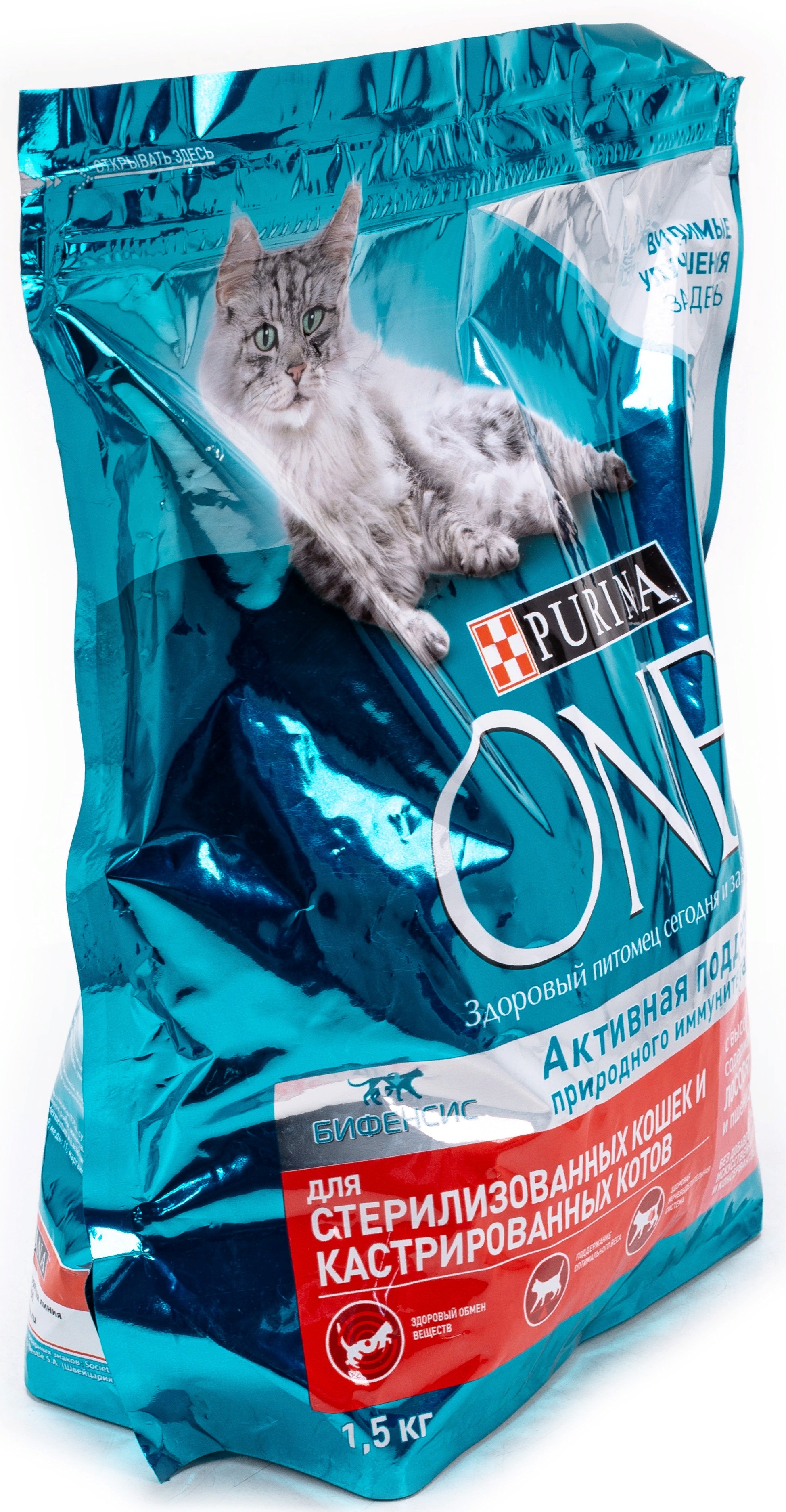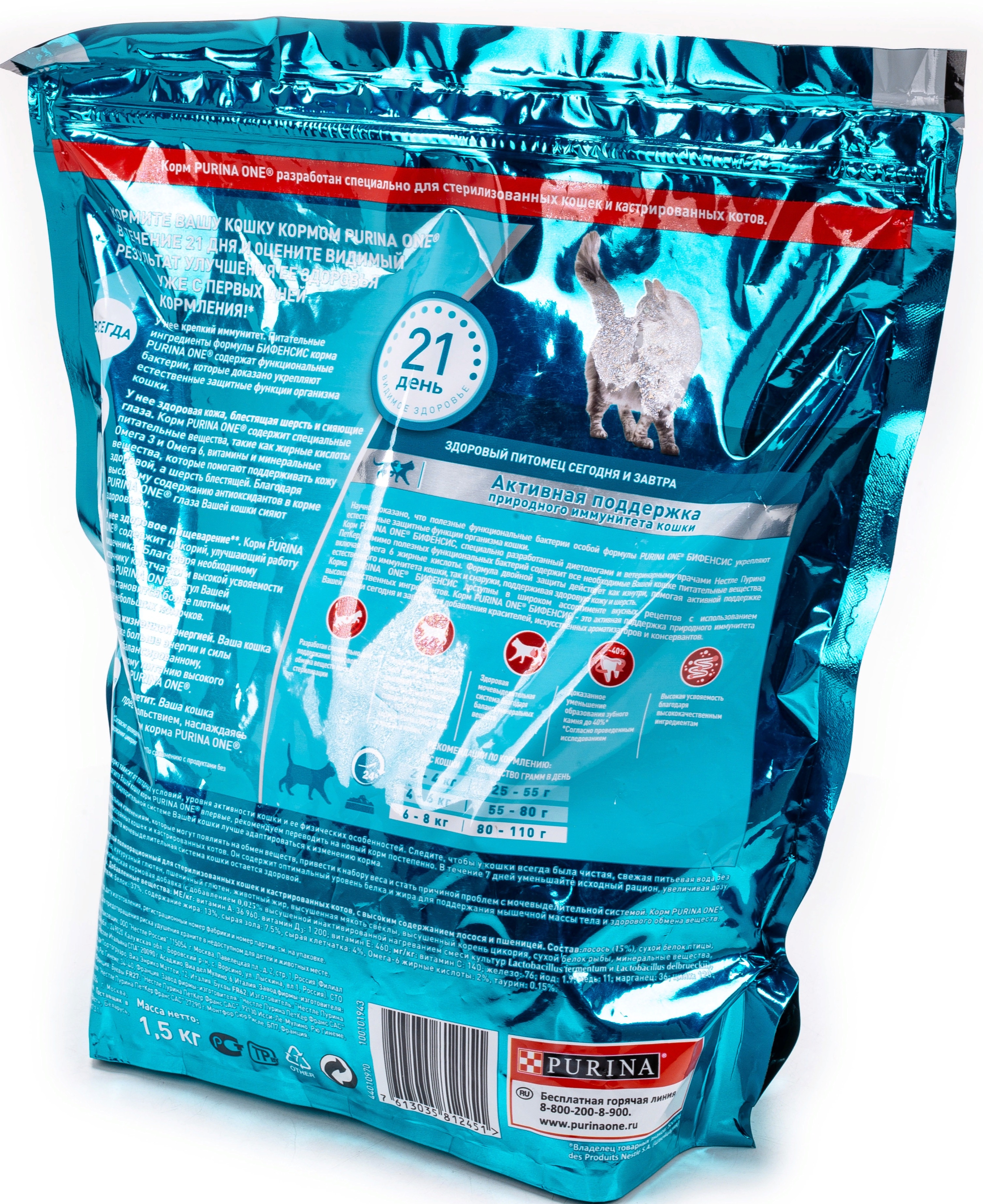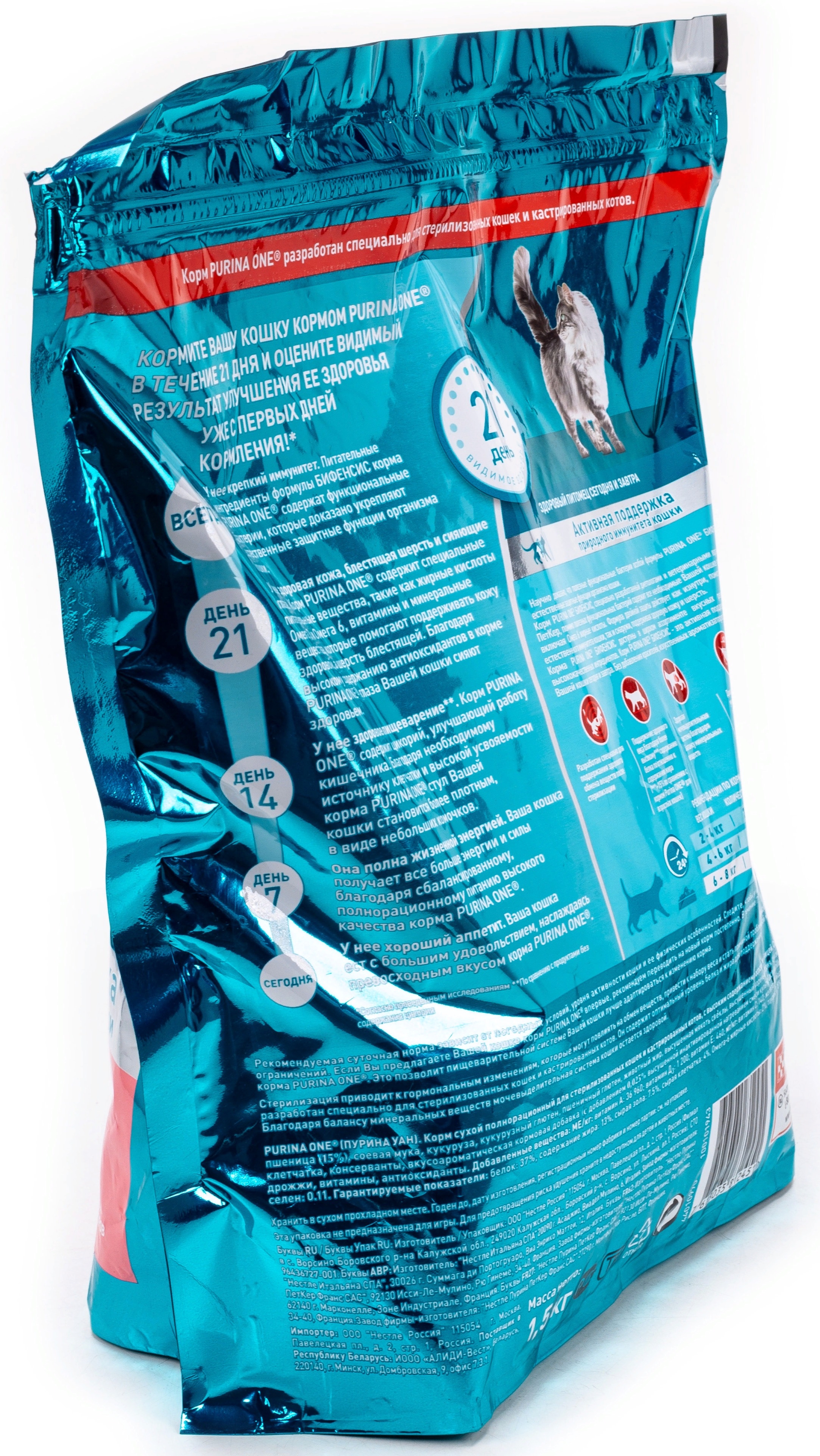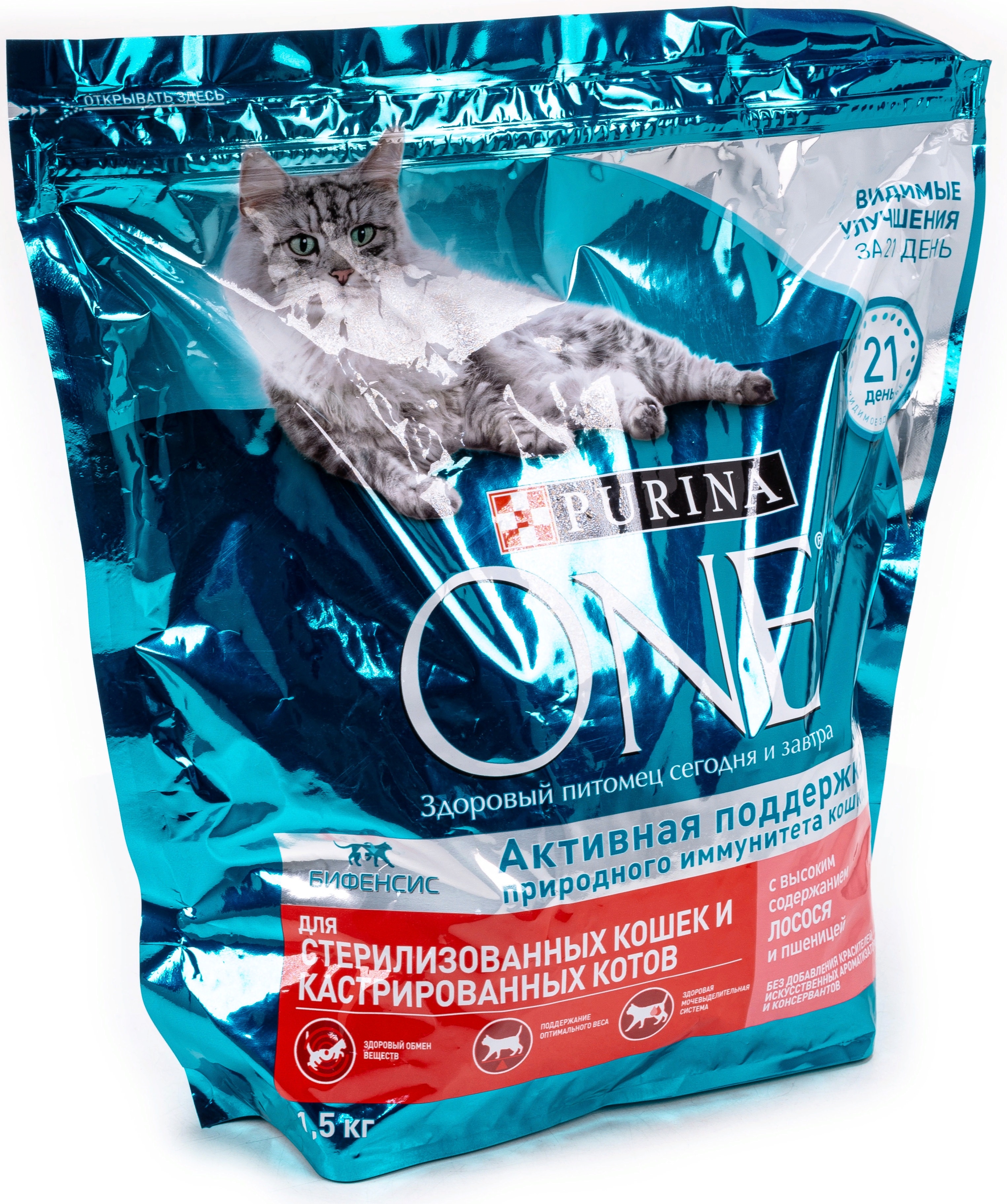 Корм сухой для кошек Purina One / Пурина Ван стерилизованных и кастрированных котов с лососем и пшеницей, хрустящие гранулы, 1.5кг / зоотовары