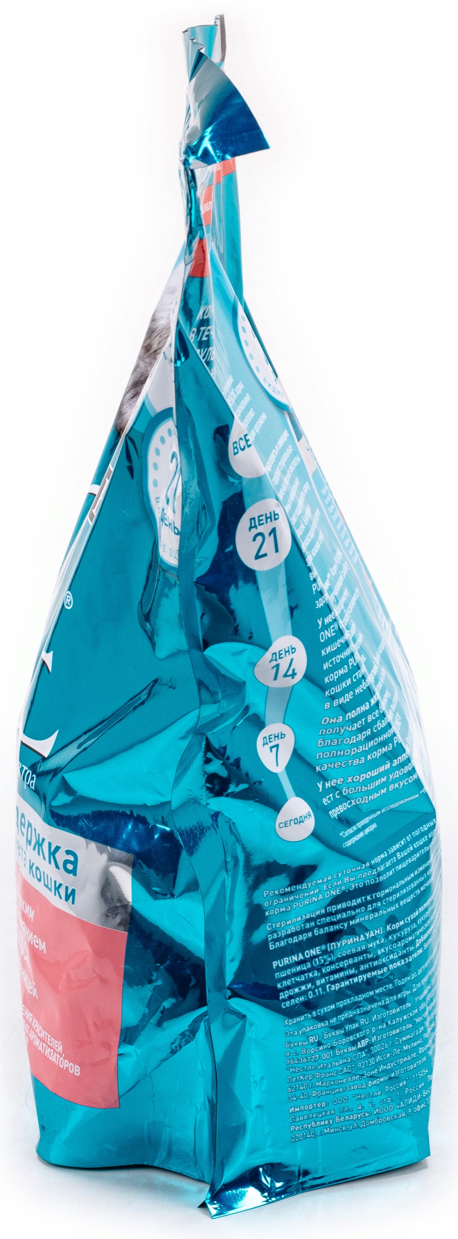 Сухой корм для стерилизованных кошек Purina One c лососем реализуется в индивидуальной упаковке — пакете. Содержит в своем составе: лосось (16,5%), сухой белок птицы, пшеница (15%), растительная мука, пшеничный глютен, кукуруза, животные жиры, сухой белок рыбы, клетчатка, высушенная мякоть свеклы, пшеничная крупка, высушенный корень цикория (2%), минеральные вещества, консерванты, гидролизат белка животного происхождения, дрожжи, витамины, аминокислоты, антиоксиданты.