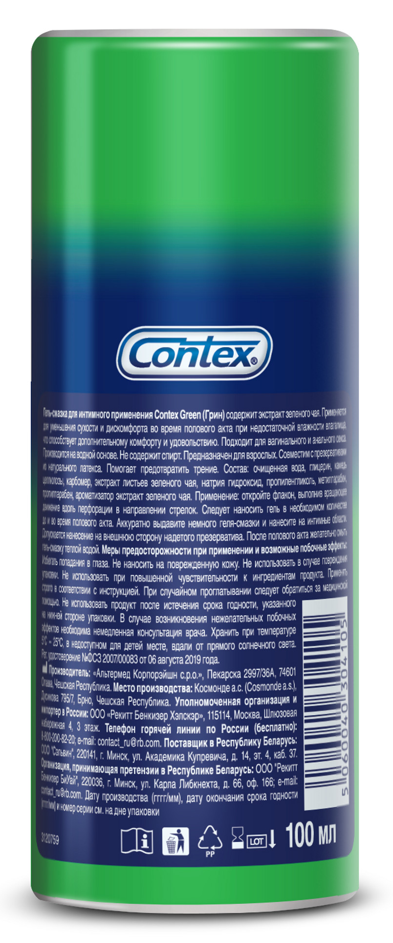 Лубрикант гель смазка Contex Green реализуется в индивидуальной упаковке — флаконе. Объем — 100 мл. В своем составе содержит: вода, глицерин, ПЕГ-40 гидрогенизированное касторовое масло, гидроксиэтилцеллюлоза, масло сандалового дерева, масло миртового дерева, молочная кислота, DMDM-гидантоин.