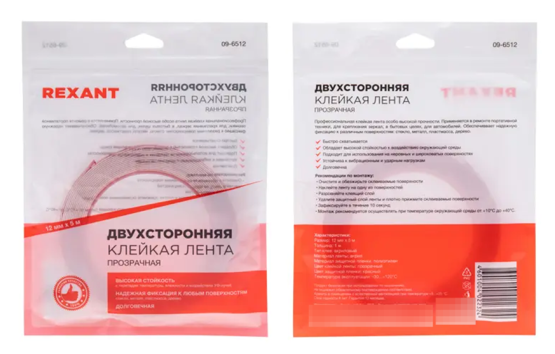 - Скотч Rexant строительный, двухсторонний, на основе акрила, прозрачный, ширина 12мм, толщина 1мм, длина 5м - 1шт.