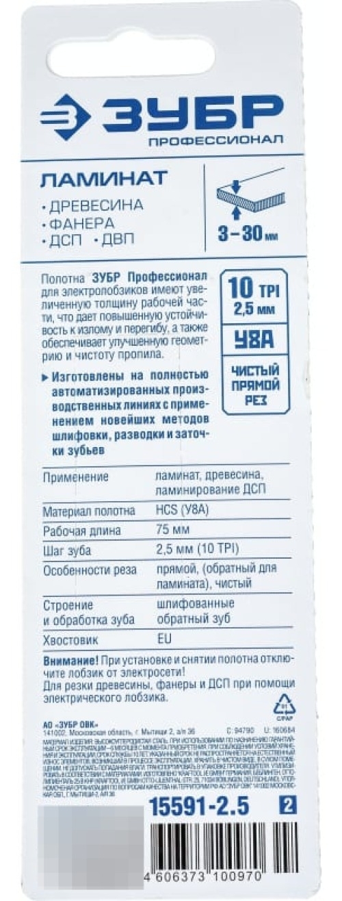 Полотна Профессионал Зубр 15591-2.5_z02 используются с электролобзиками. Применяются для обработки многослойной фанеры, ДСП с покрытием, ламината. Полотно имеет увеличенную толщину, что улучшает устойчивость к излому и перегибу. Оснастка имеет EU - хвостовик. Изготовлено из хромванадиевой стали, что увеличивает рабочий ресурс и стойкость к нагрузкам. Особое строение и заточка зубьев обеспечивает чистый обратный рез.