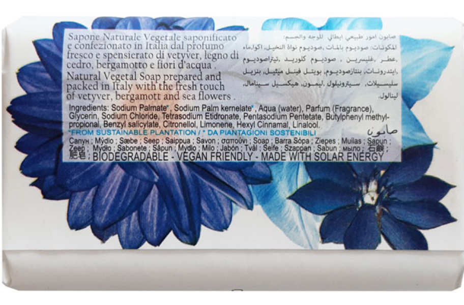 Nesti Dante — экологически чистое мыло, не содержит вредных поверхностно-активных веществ, сульфатов, парабенов, синтетических масел и искусственных красителей. Мыло не размокает и быстро восстанавливается после длительного контакта с водой. Liberty (Свобода) со свежим оттенком ветивера, бергамота и морского цветка.